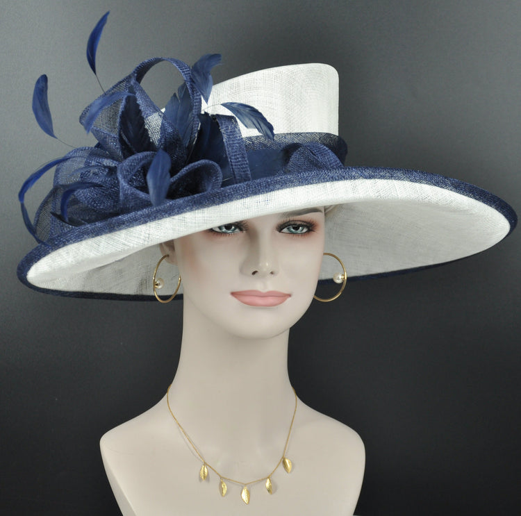 Church Kentucky Derby Hat Carriage Tea Party Wedding Wide Brim Woman’s Royal Ascot Hat in Solid Sinamay Hat White w Navy Blue