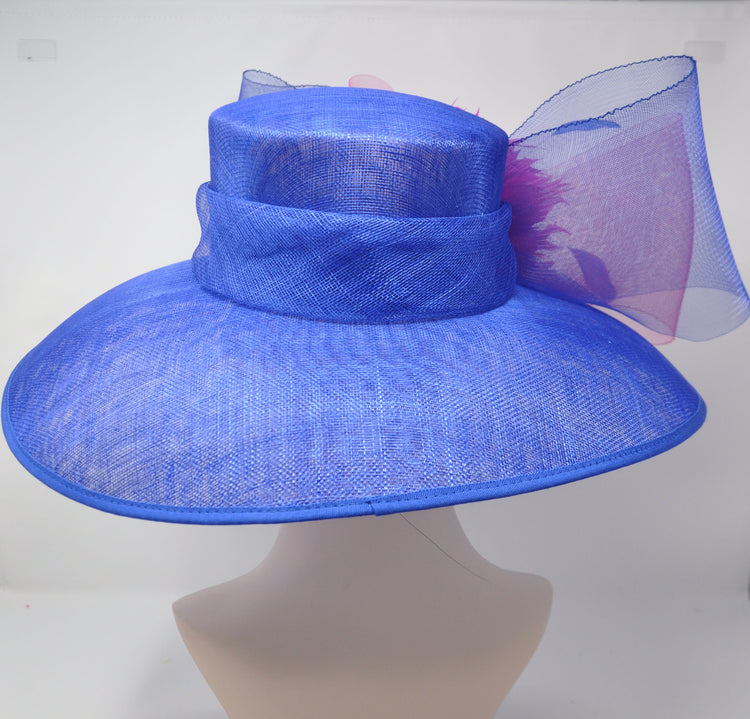 Church Kentucky Derby HatCarriage Tea Party Wedding Wide Brim Royal Ascot Hat in Solid Sinamay Hat Royal Blue w Hot Pink