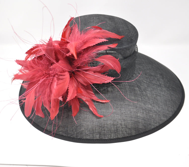 Church Kentucky Derby HatCarriage Tea Party Wedding Wide Brim Royal Sinamay Hat Black w Burgundy Flowers