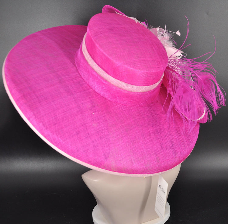 Fuchsia Pink Feather Derby Hat: Wide Brim Sinamay Headpiece