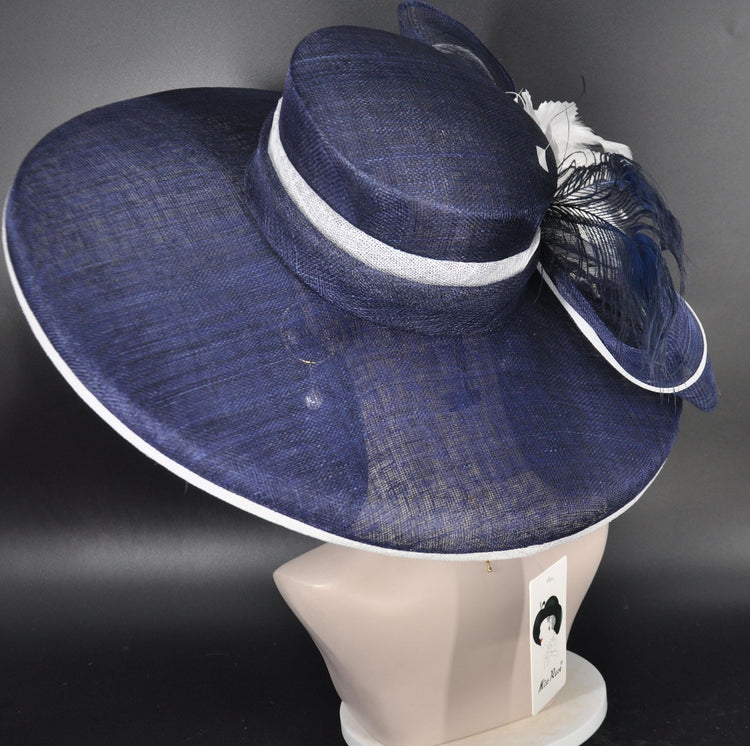 Navy Blue Sinamay Derby Hat: Wide Brim Feather Headpiece