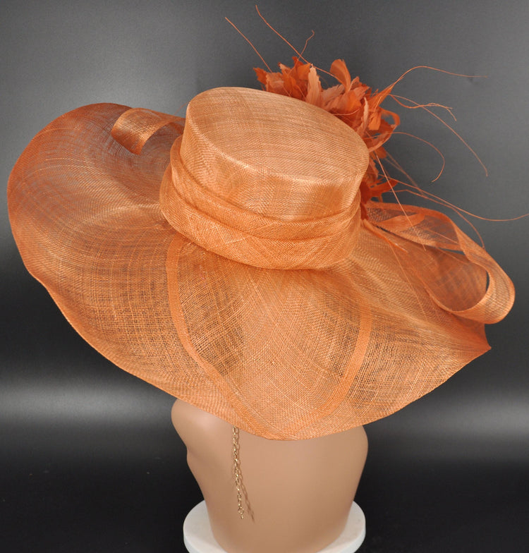 Orange Feather Flower Sinamay Derby Hat: Wide Brim Church Hat