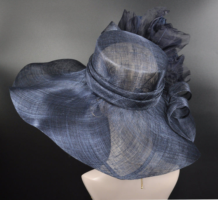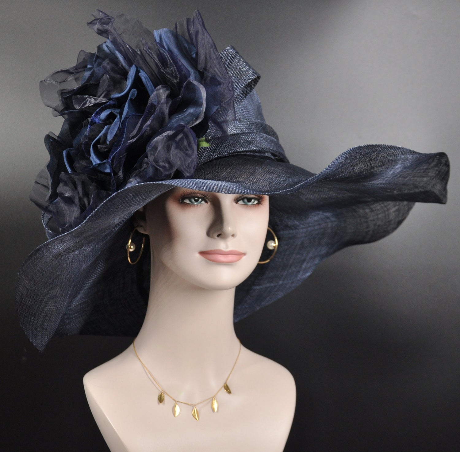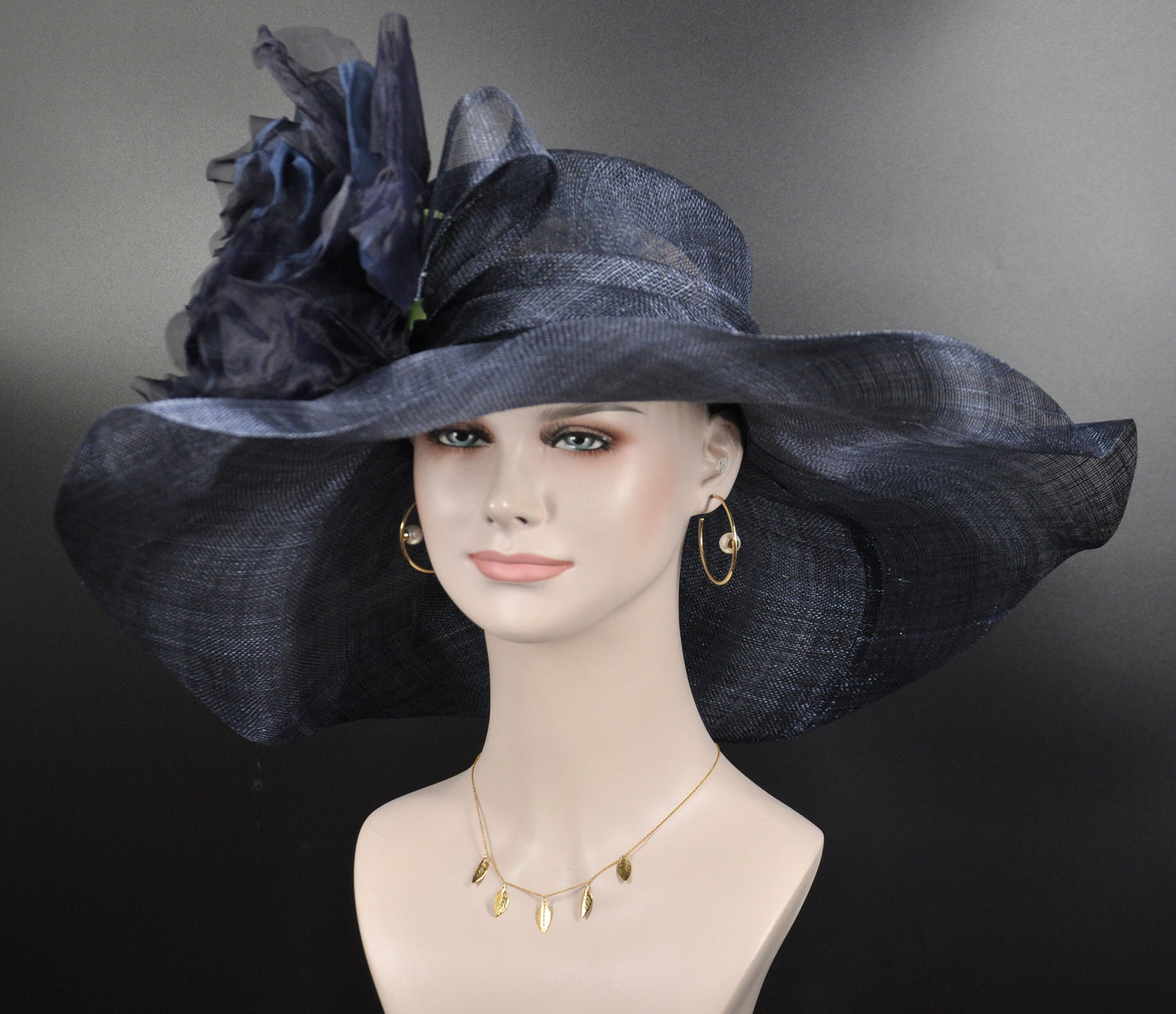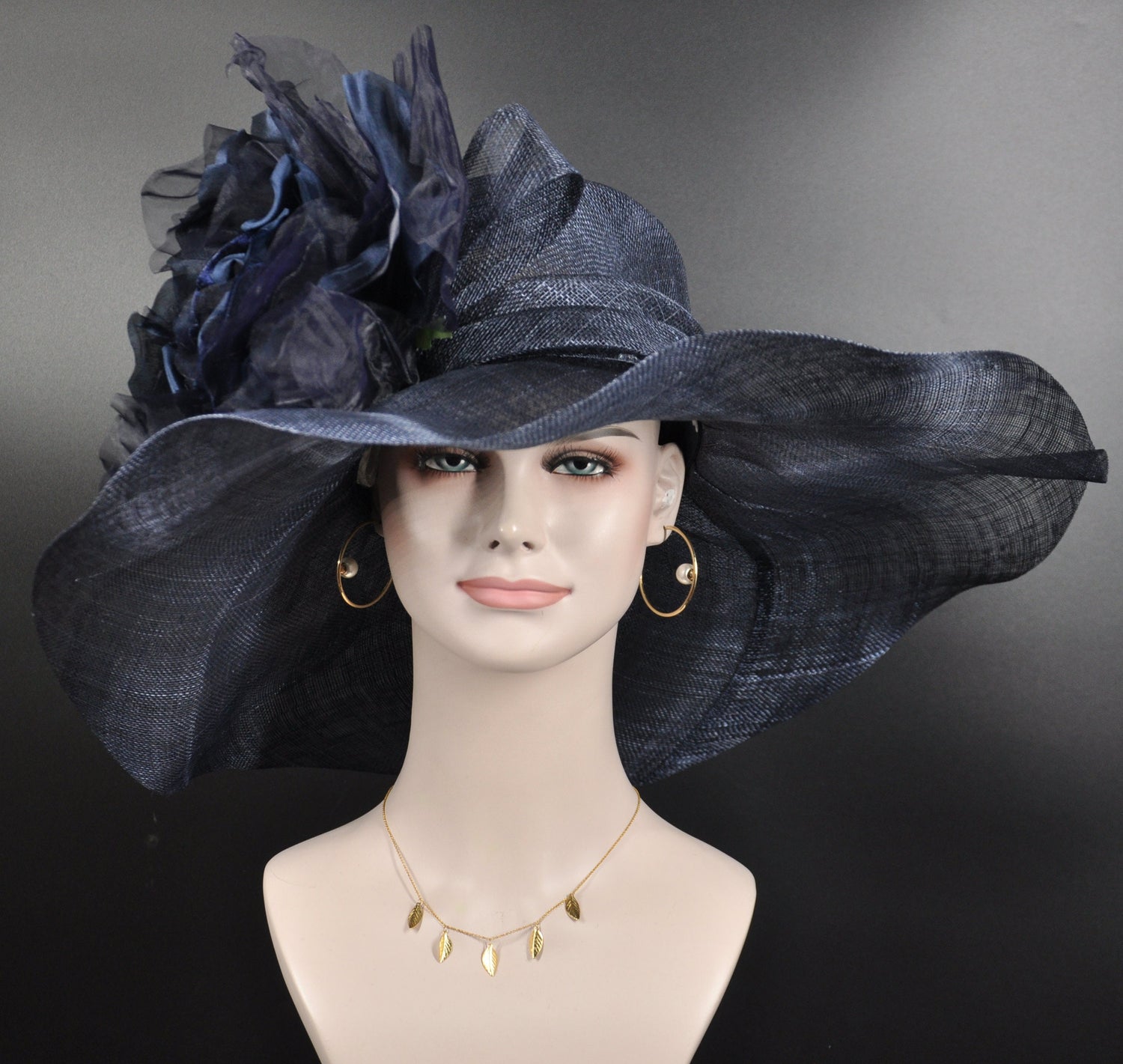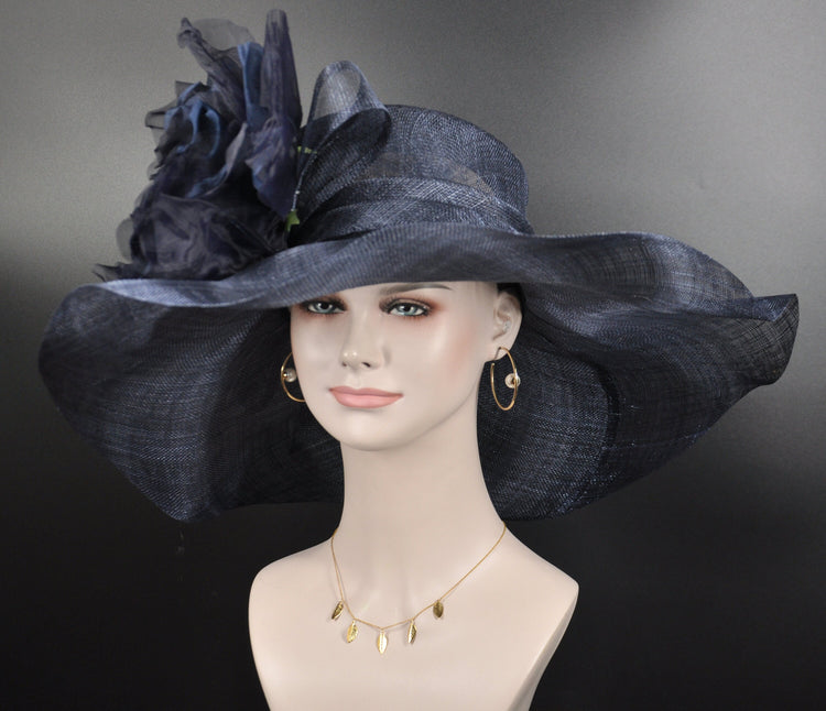 Navy Blue Sinamay Kentucky Derby Hat: Jumbo Silk Flower Wide Brim