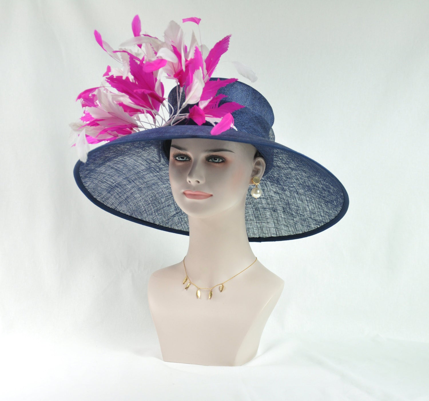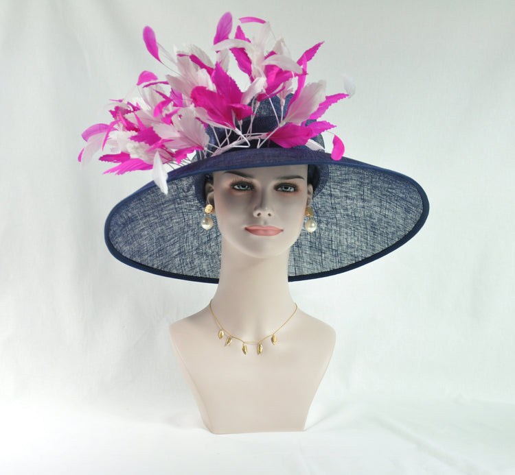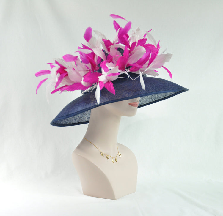 Navy Sinamay Derby Hat: Feather Flowers, Wide Brim Royal Ascot