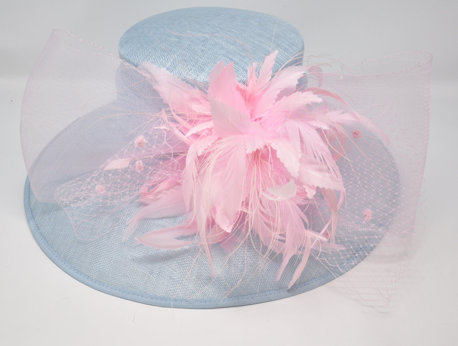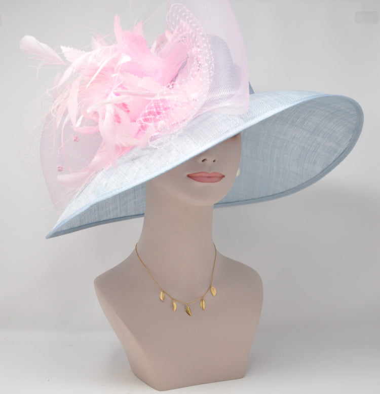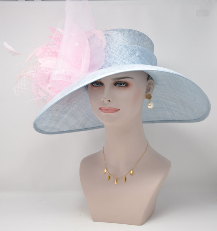 Powder Blue Sinamay Derby Hat: Pink Feather Wide Brim Ascot Hat