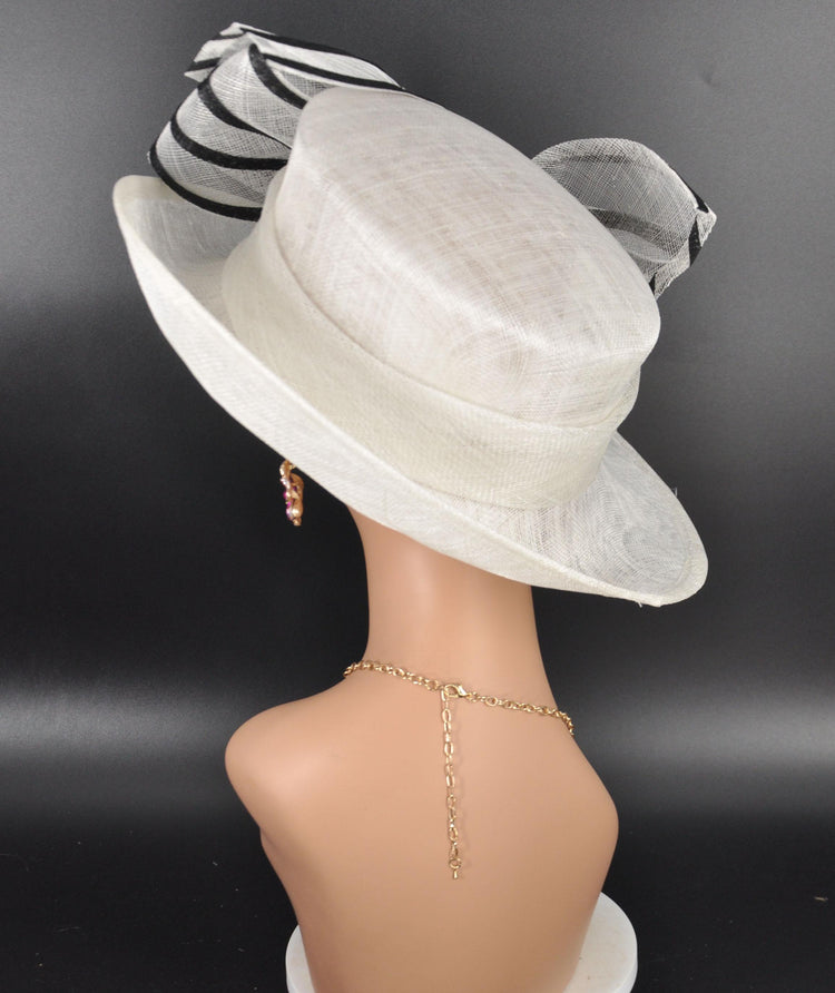 Sinamay Derby Hat: White Ascot Hat with Black Striped Bow