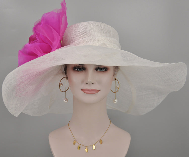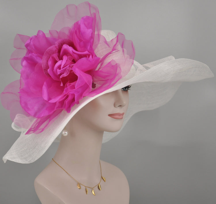 Sinamay Kentucky Derby Hat: White Floppy Brim with Fuchsia Silk Flower
