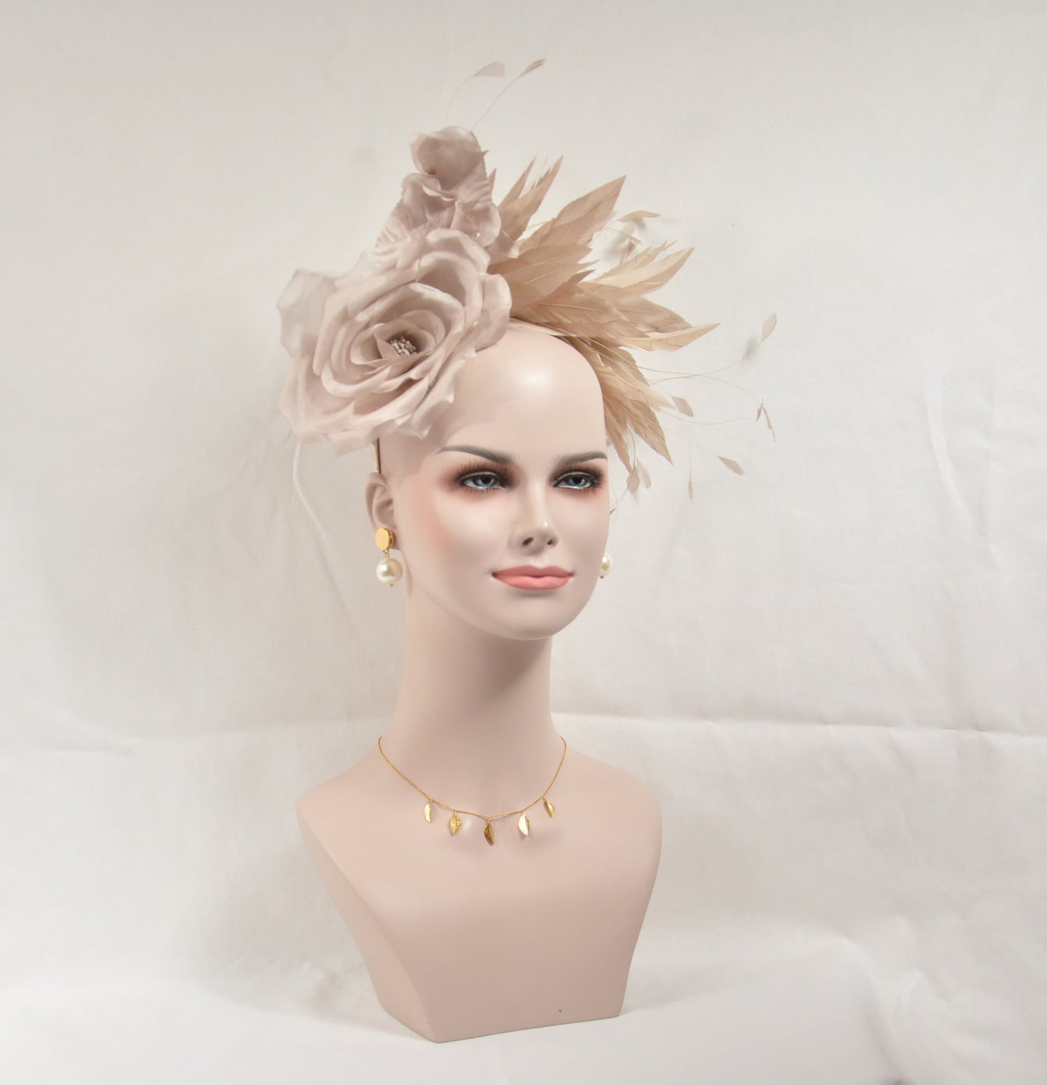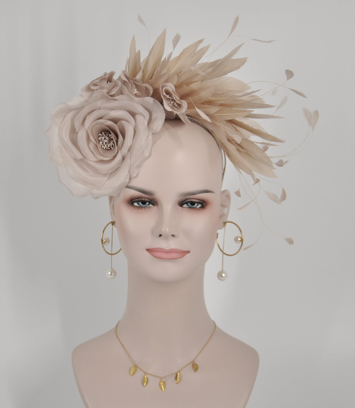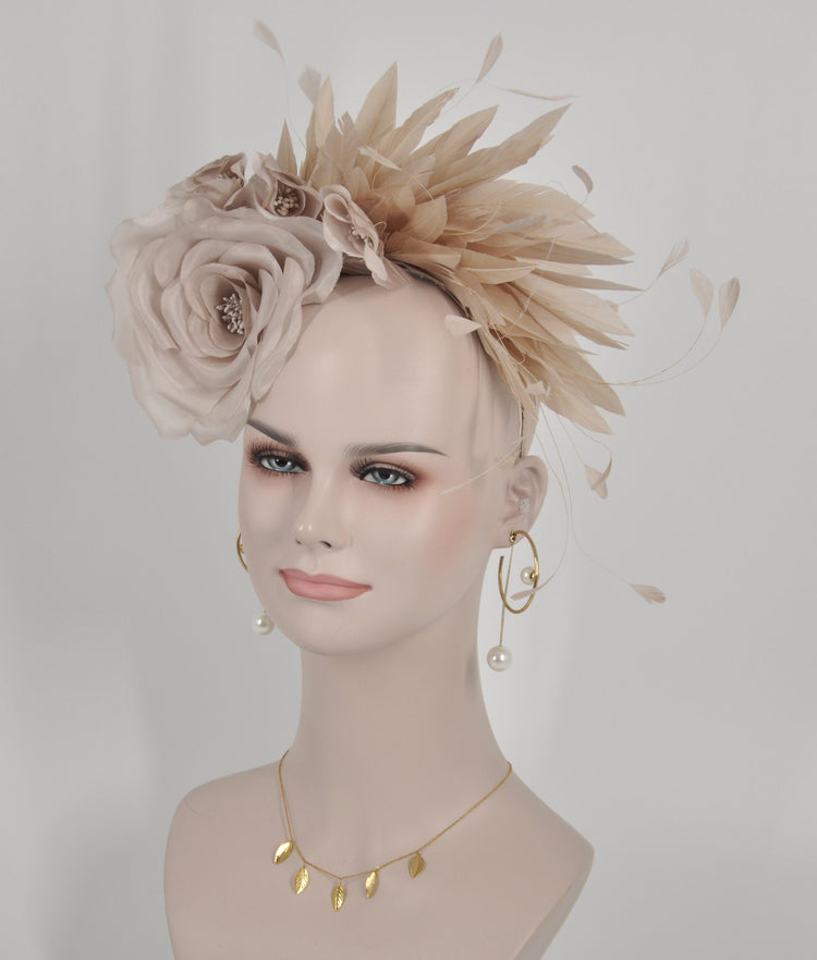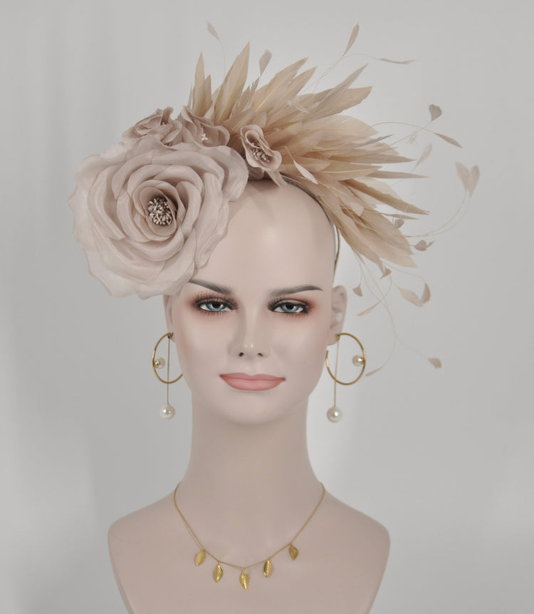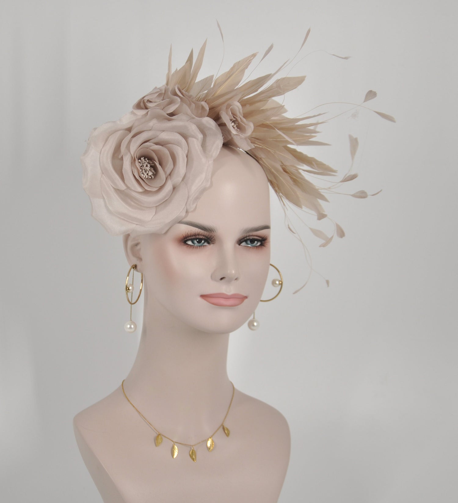 Champagne Silk Flower Fascinator Hat: Goose & Rooster Feathers