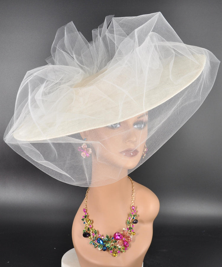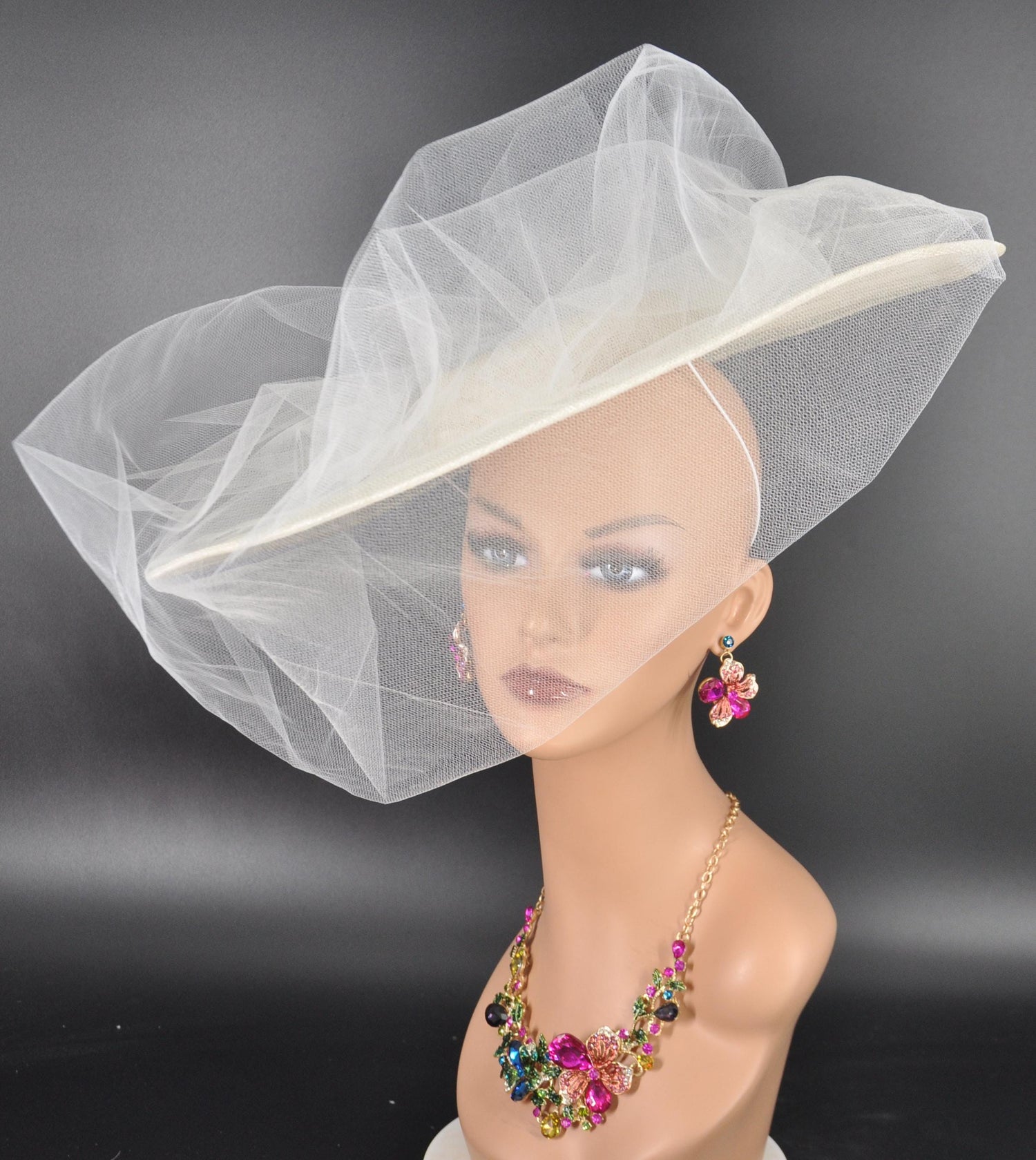 Large Brim Sinamay Fascinator Hat W Tulle Veil for Kentucky Derby Hat Millinery Supply Round Shape 18.5 Diameter, hold by elastic