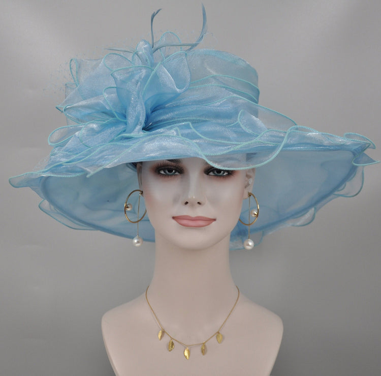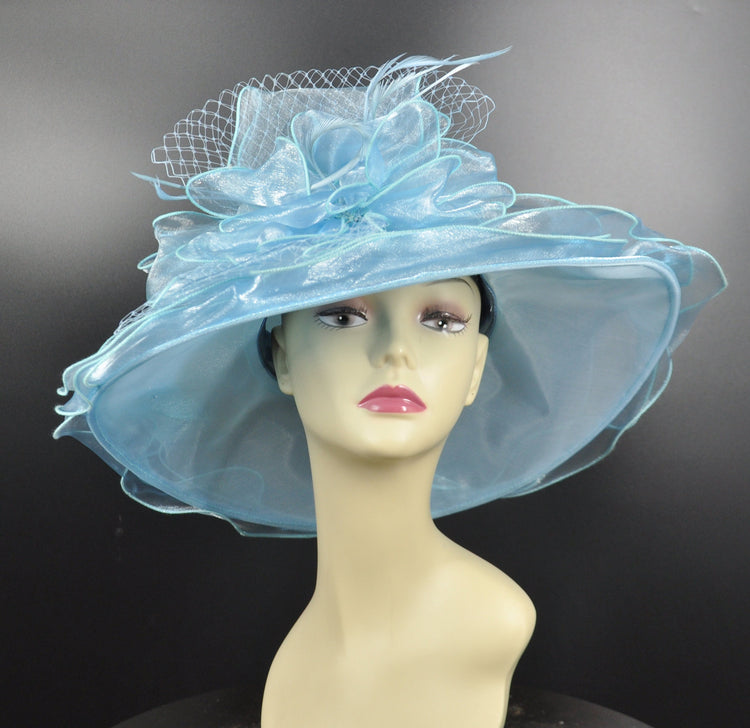 Blue Organza Kentucky Derby Hat: Medium Brim Wedding Church Hat