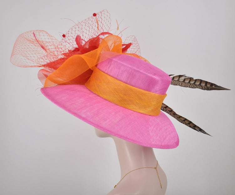 Church Kentucky Derby Hat Wide Brim Sinamay Hat Carriage Tea Party Wedding Hot Pink w Orange Red Peacock Feathers