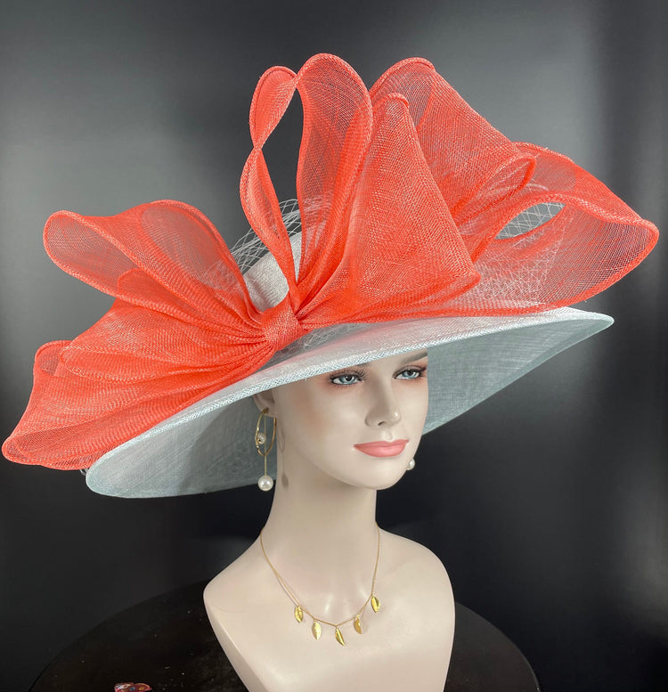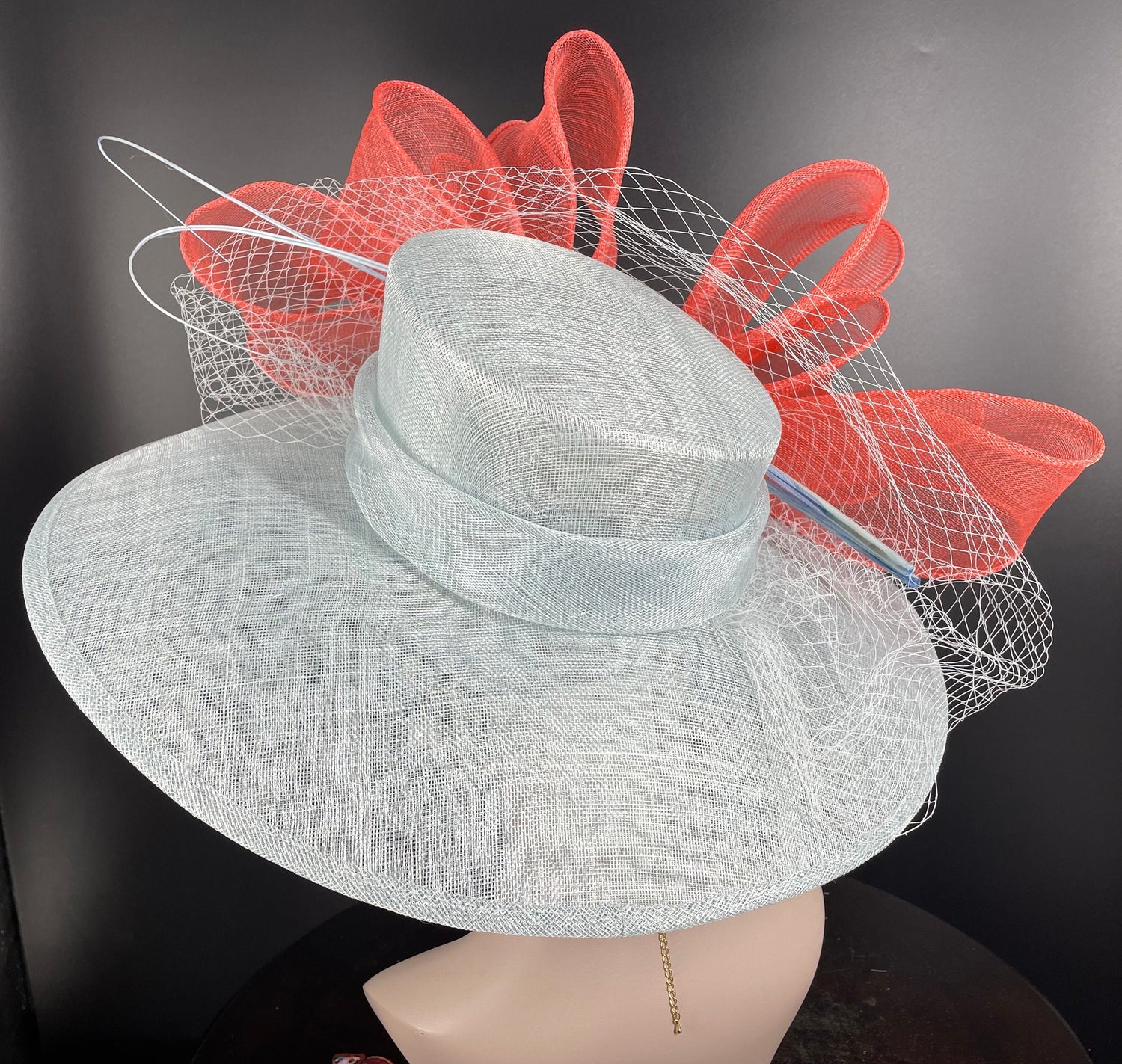 Coral & Powder Blue Sinamay Derby Hat: Ascot Wedding Party Hat
