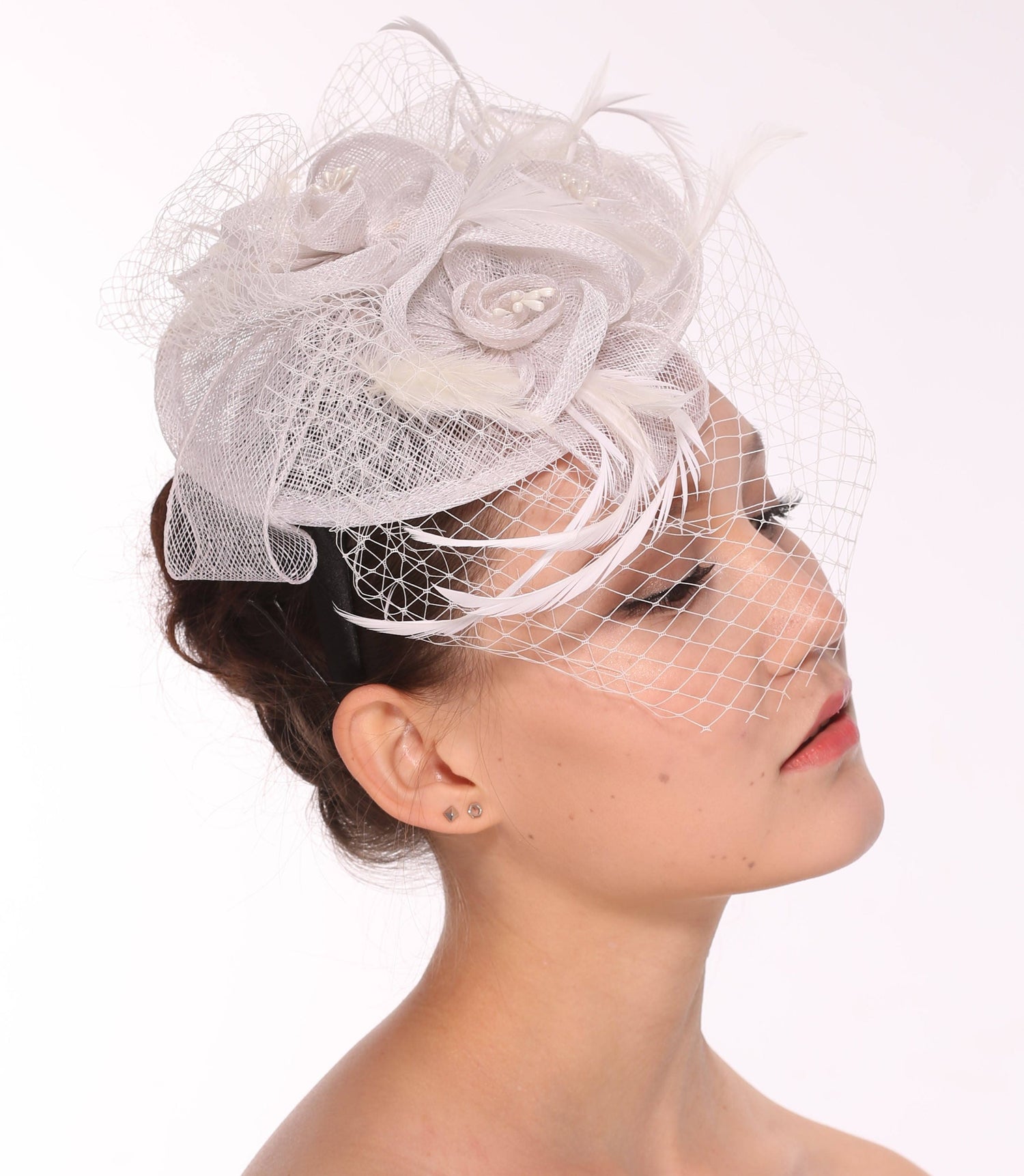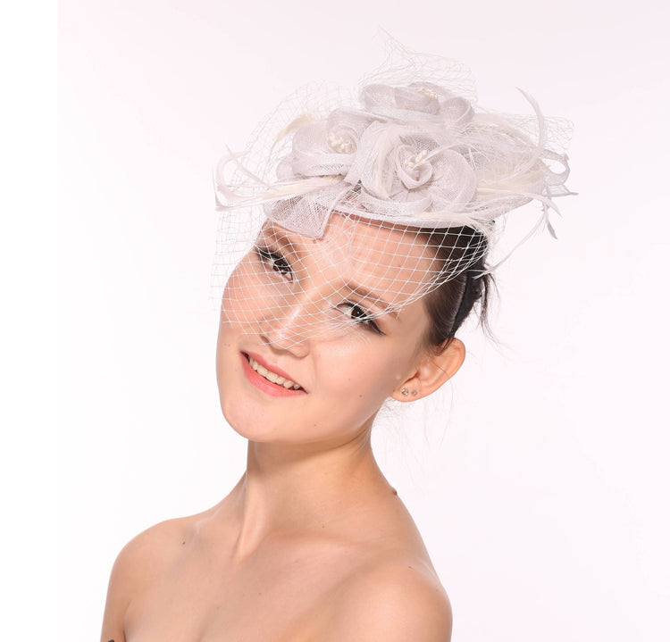 Fancy Sinamay Feathers Trio Floral Net Headband Fascinator Cocktail Hat Off White
