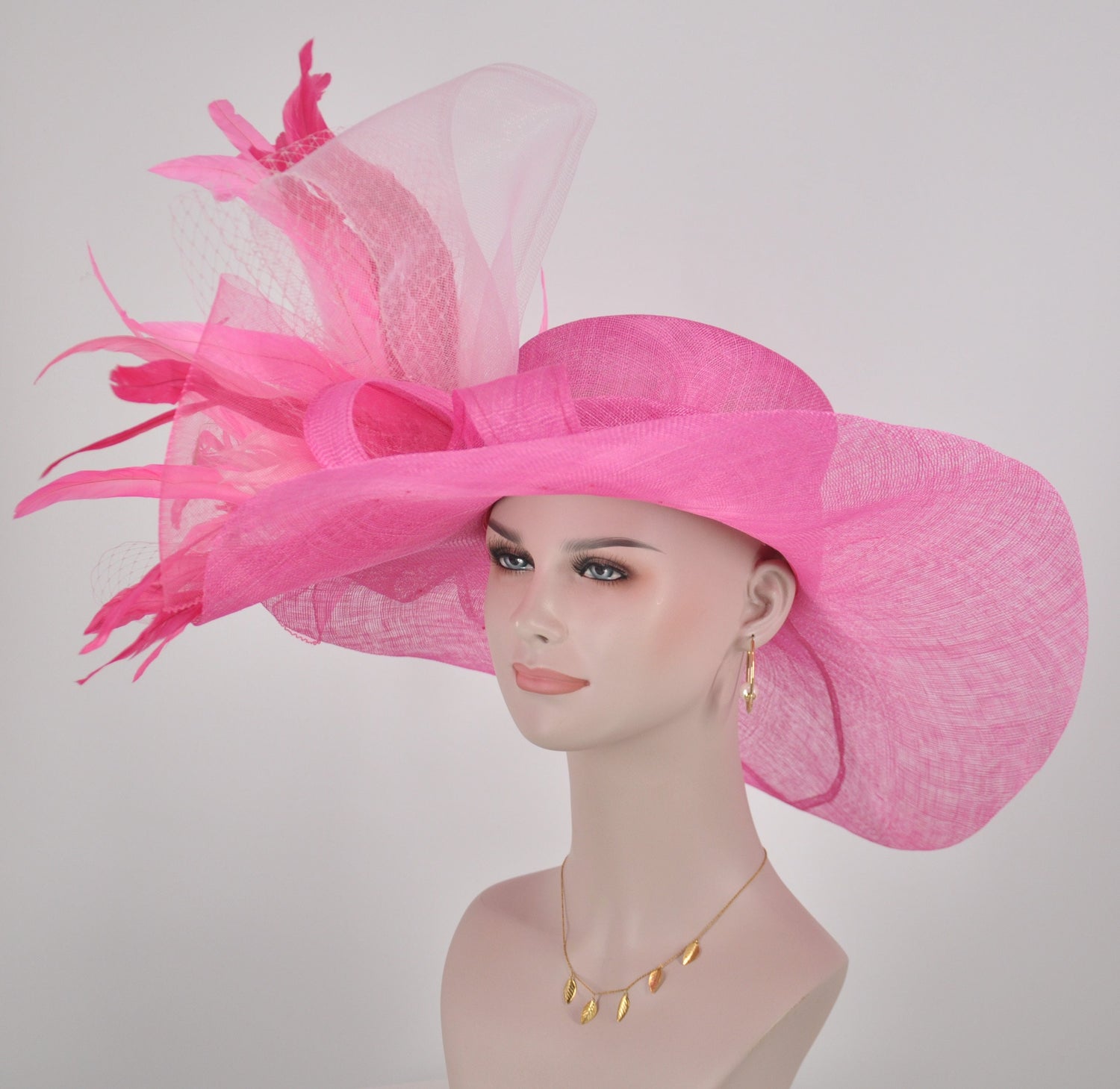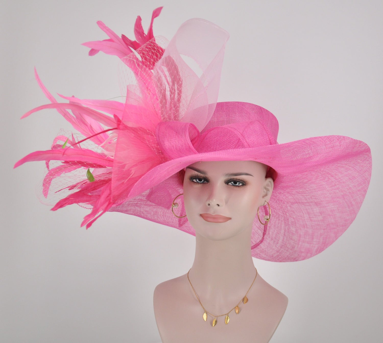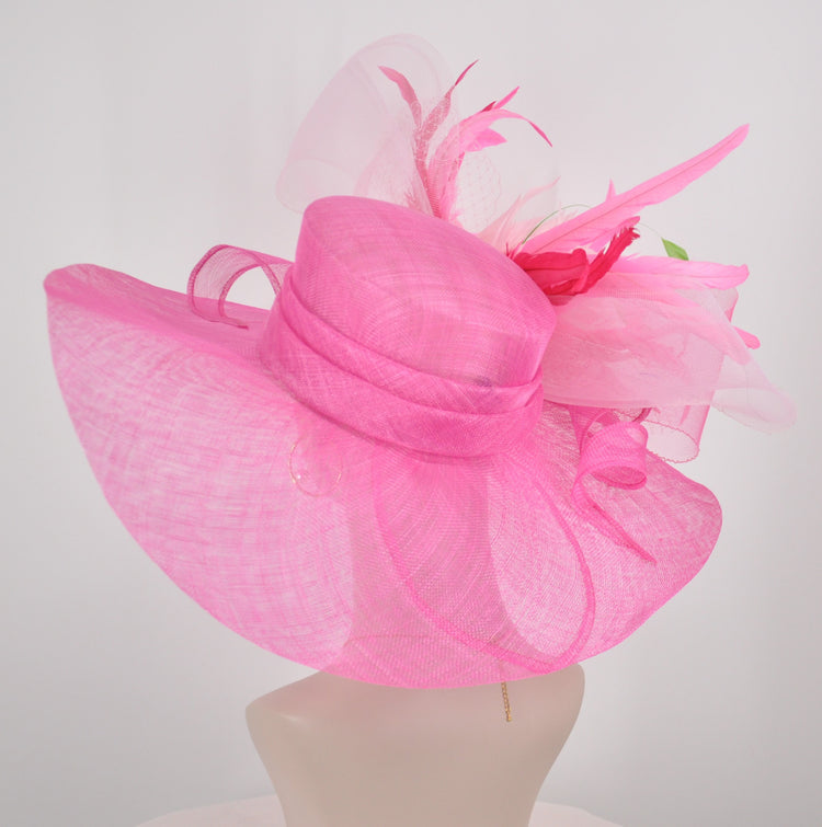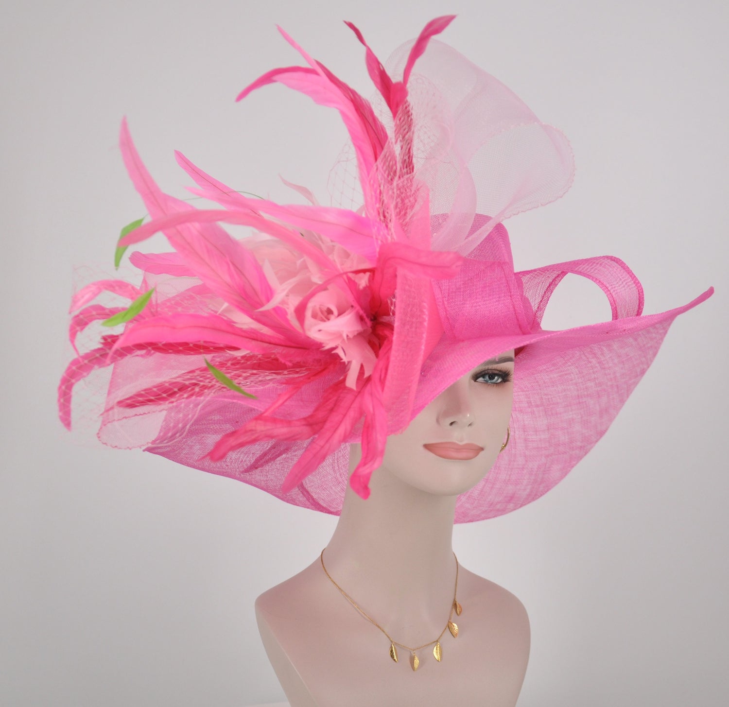 Hot Pink /Fuchsia/Pink/Green Jumbo Bow and Feather Flowers Kentucky Derby Hat, Tea Party Hat Wide Brim Sinamay Hat