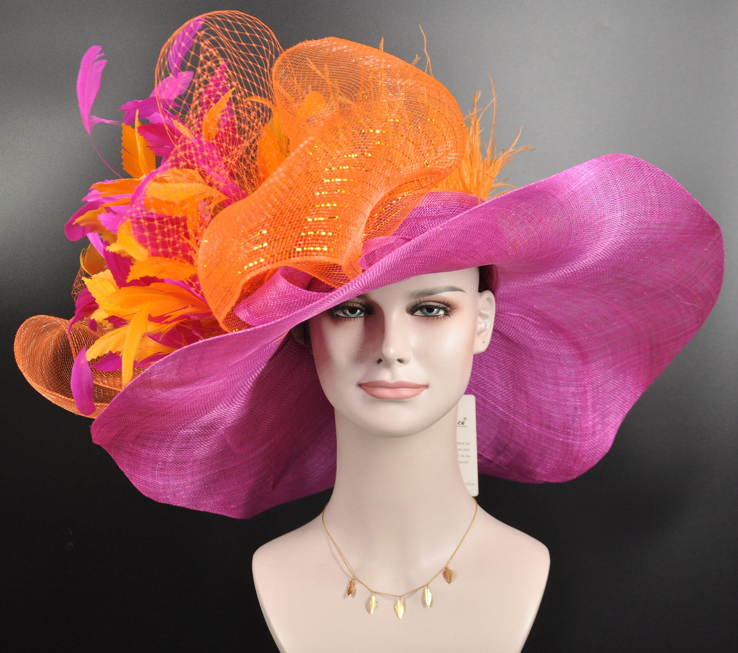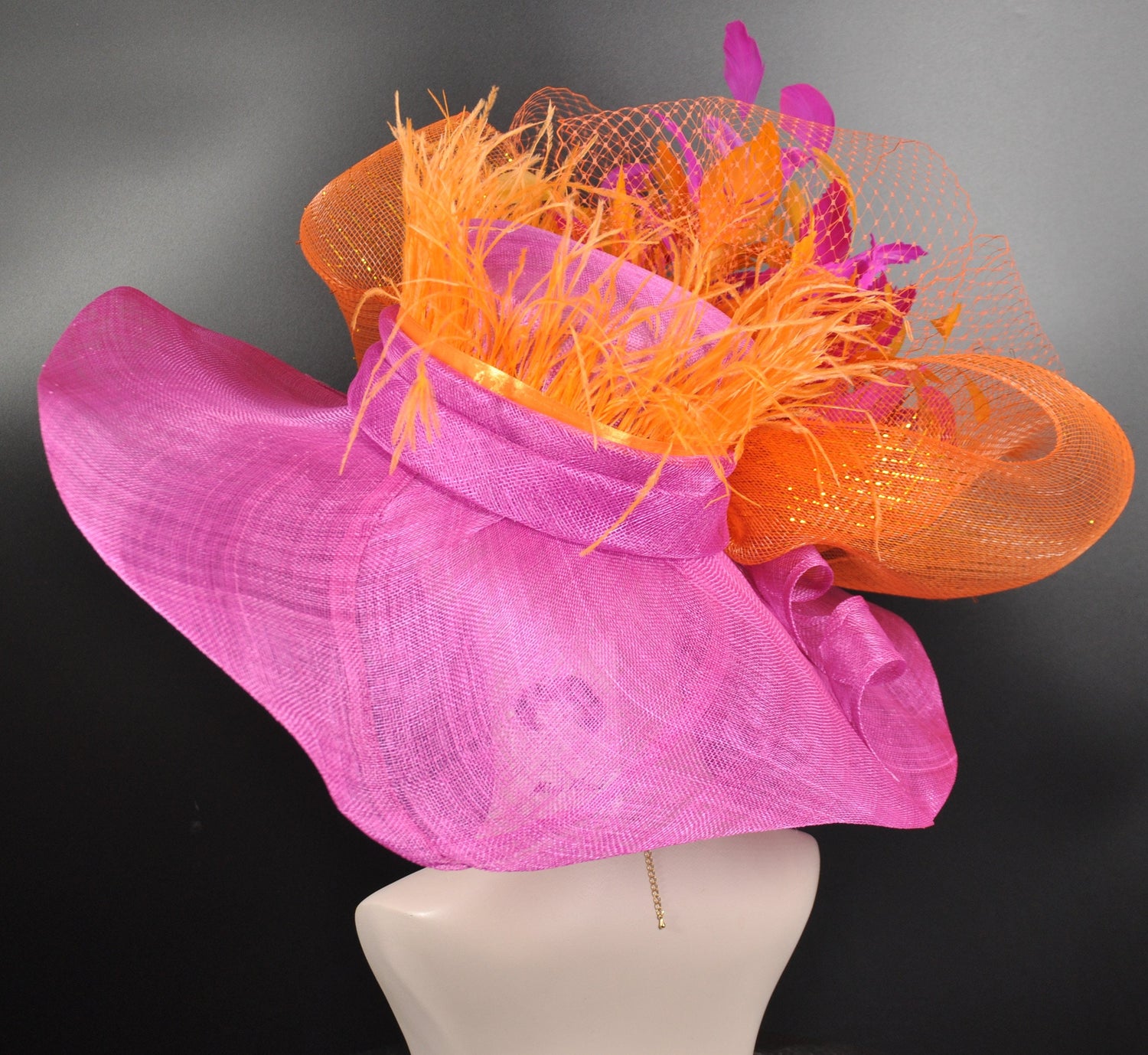 Hot Pink Sinamay Derby Hat: Orange Bow & Feather Flowers
