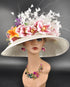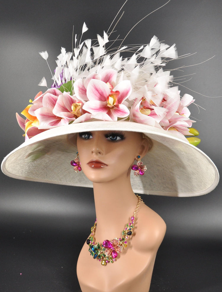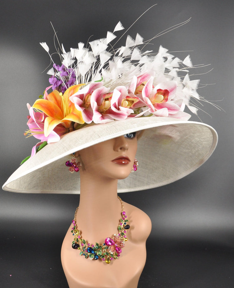 Ivory Sinamay Kentucky Derby Hat: Wide Brim, Lily & Orchid Flowers