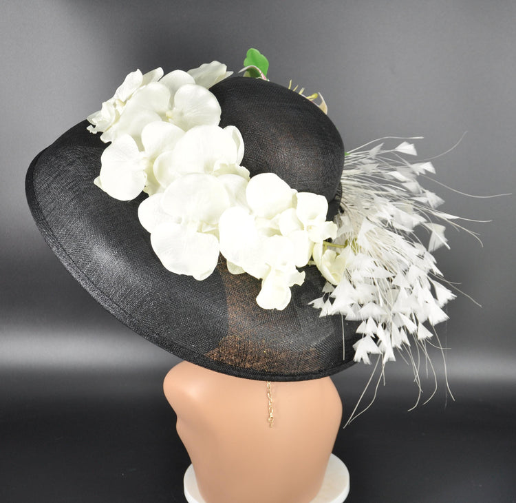 This stunning black Hepburn-style Kentucky Derby hat exudes elegance and sophistication. The wide-brimmed design is adorned with delicate off white Phalaenopsis orchids, ivoey yellow and green, and genuine feathers in soft ivory. The asymmetrical floral arrangement creates a dynamic and artistic look, making it a perfect statement piece for a race day event or a formal garden party. The hat's classic black base contrasts beautifully with the lively floral embellishments, offering a timeless yet eye-catching appeal.