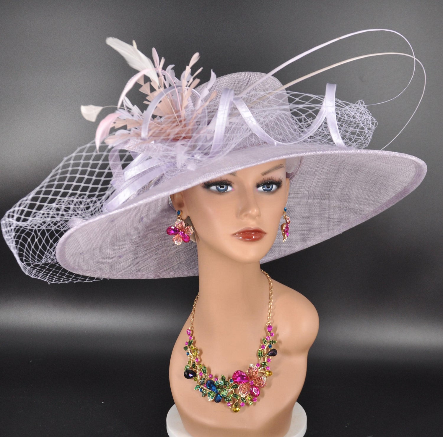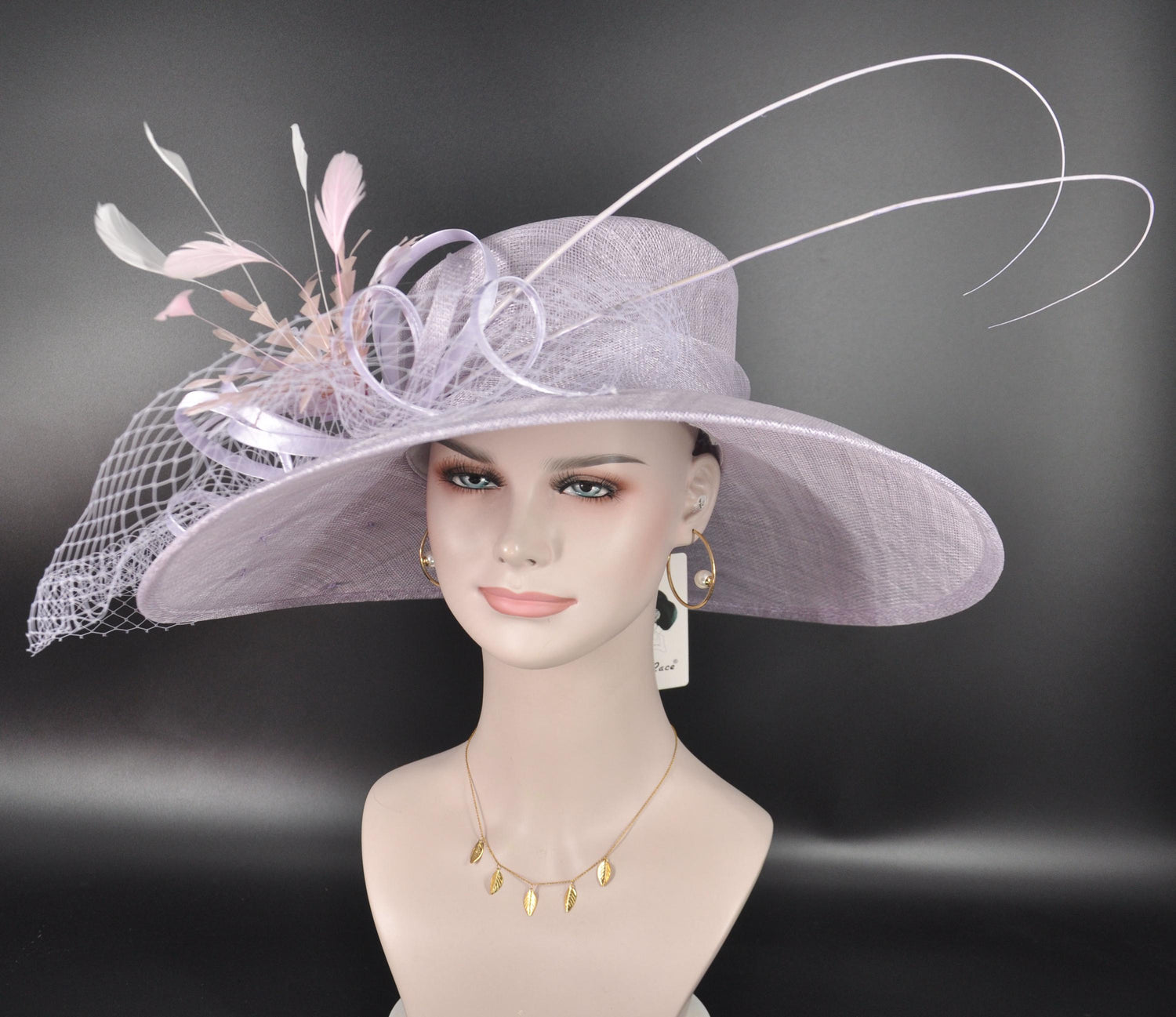 Lilac Sinamay Wide Brim Hat: Feather Flower Kentucky Derby Hat
