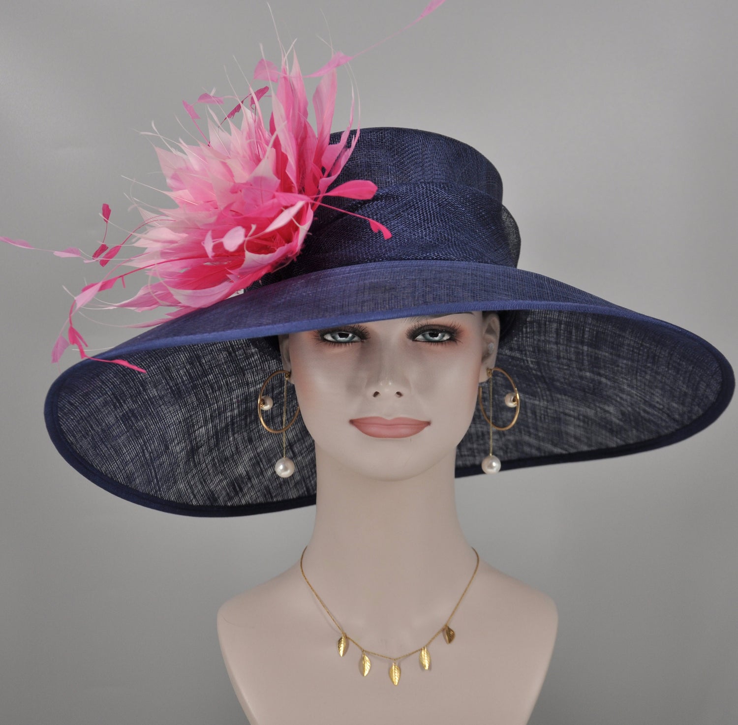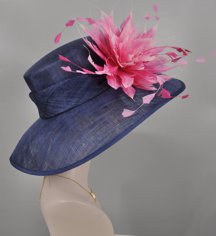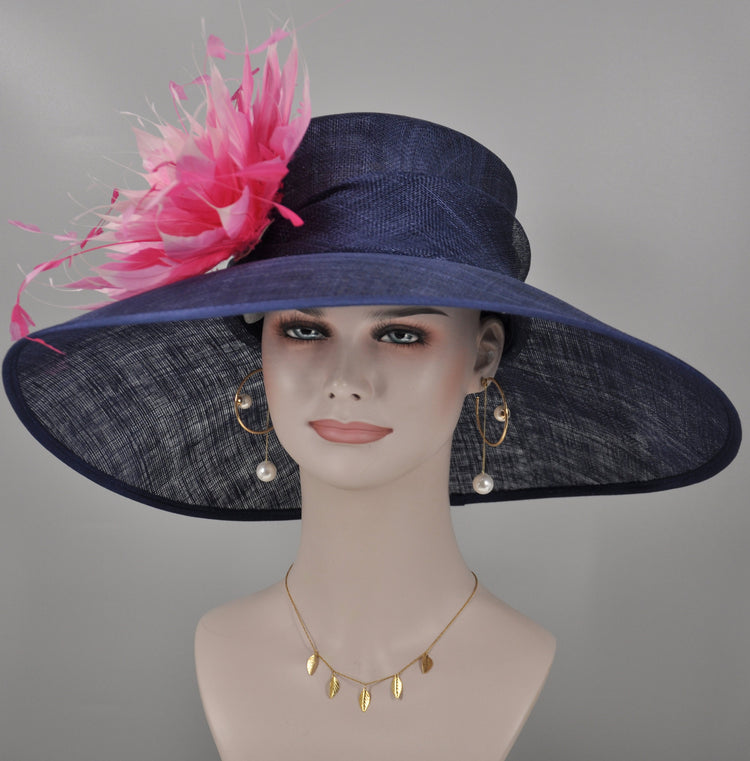 Navy Blue w Fuchsia Hot Pink and Pink Feather Flower Kentucky Derby Hat Tea Party Carriage Party Royal AscotWide Brim Sinamay Hat