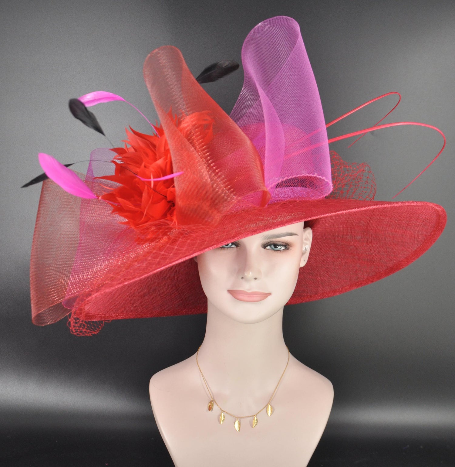 Red Fuchsia Sinamay Derby Hat: Feather Flower Tea Party Hat