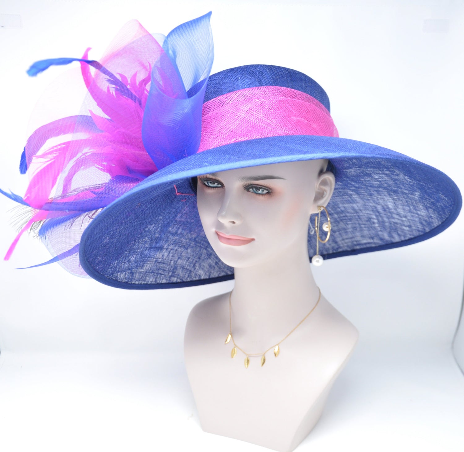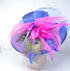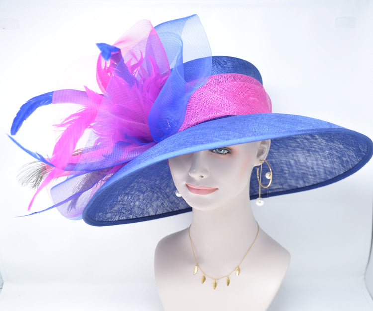 Royal Blue Sinamay Derby Hat: Hot Pink Feather Flowers & Peacock Feathers