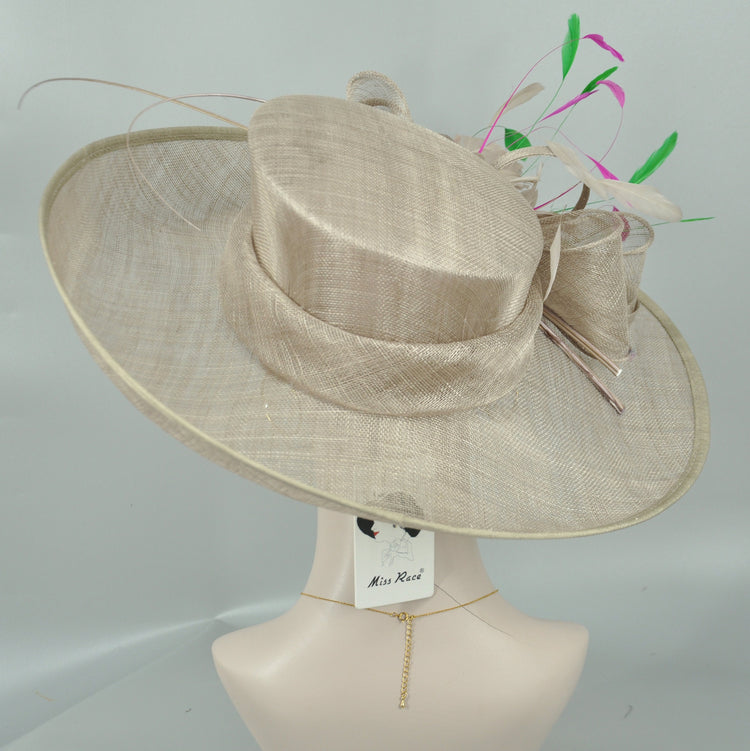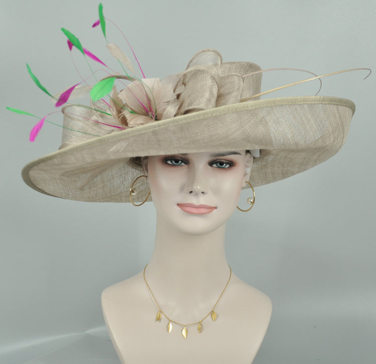 Sinamay Kentucky Derby Hat: Taupe Wide Brim Feather Fascinator