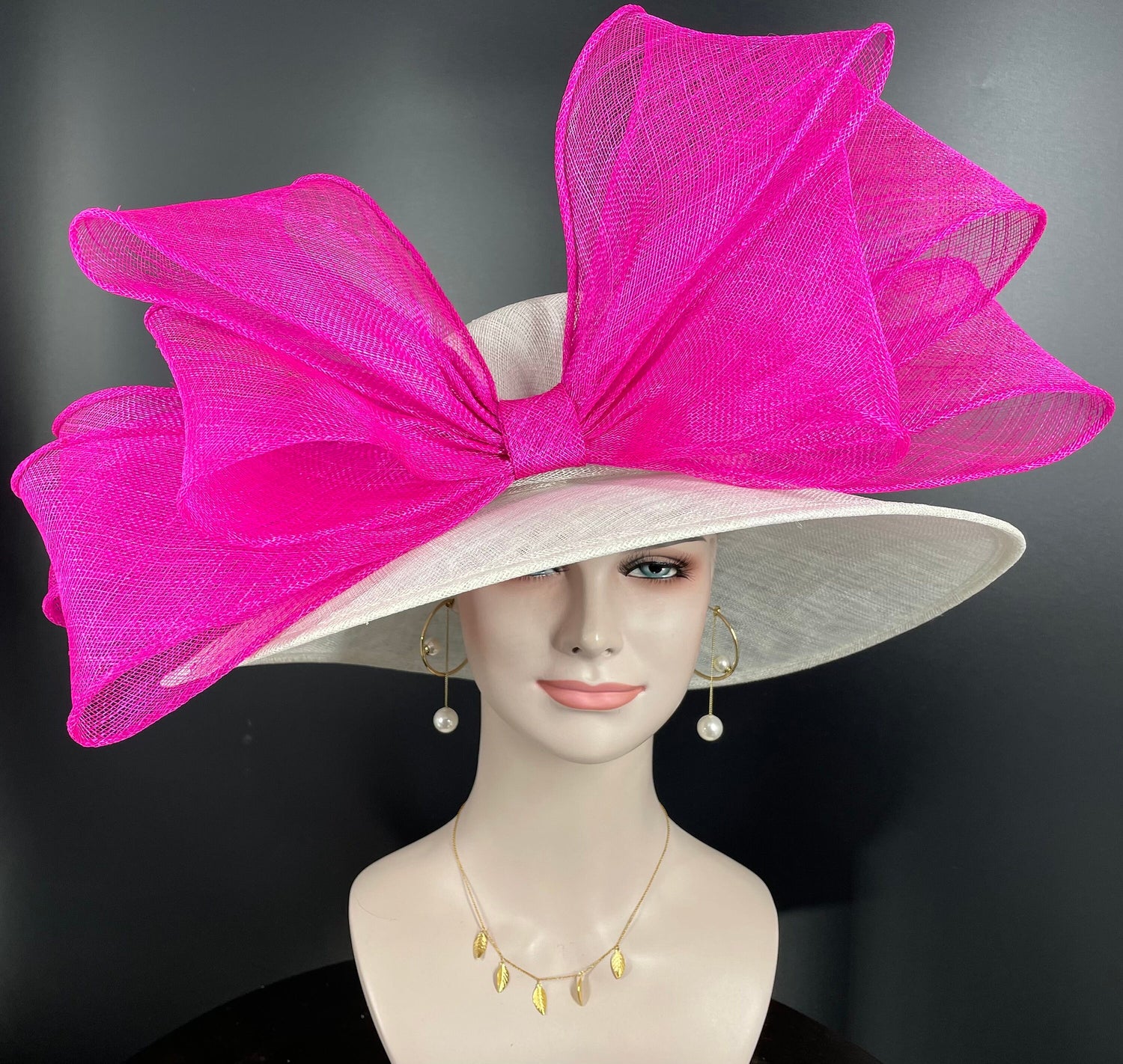 Sinamay Kentucky Derby Hat: White Wide Brim with Fuchsia Bow
