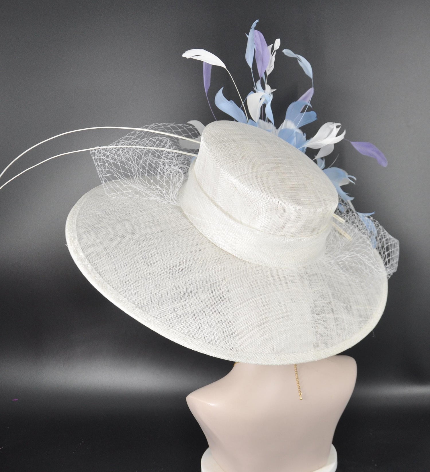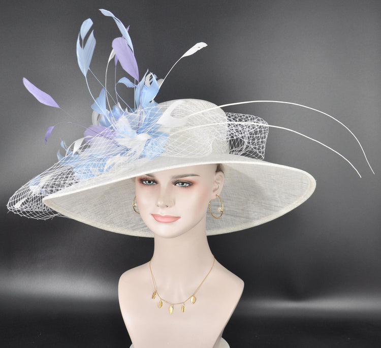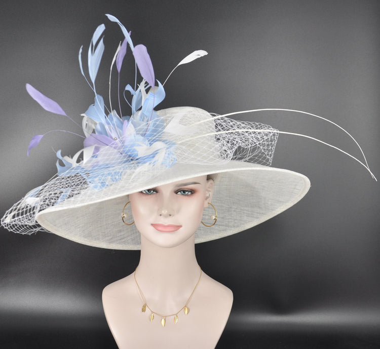 Wide Brim Sinamay Derby Hat: White, Powder Blue & Lilac
