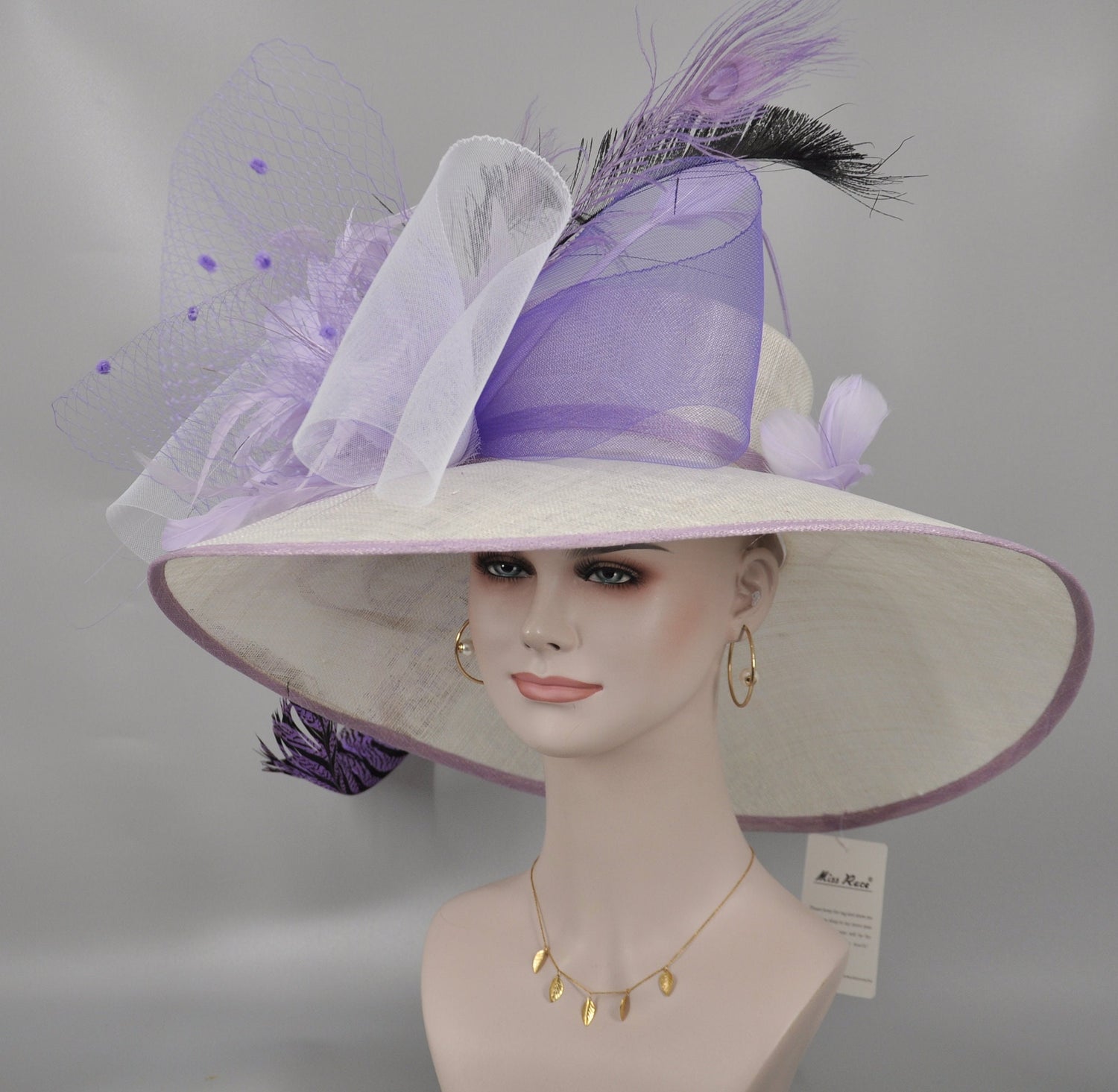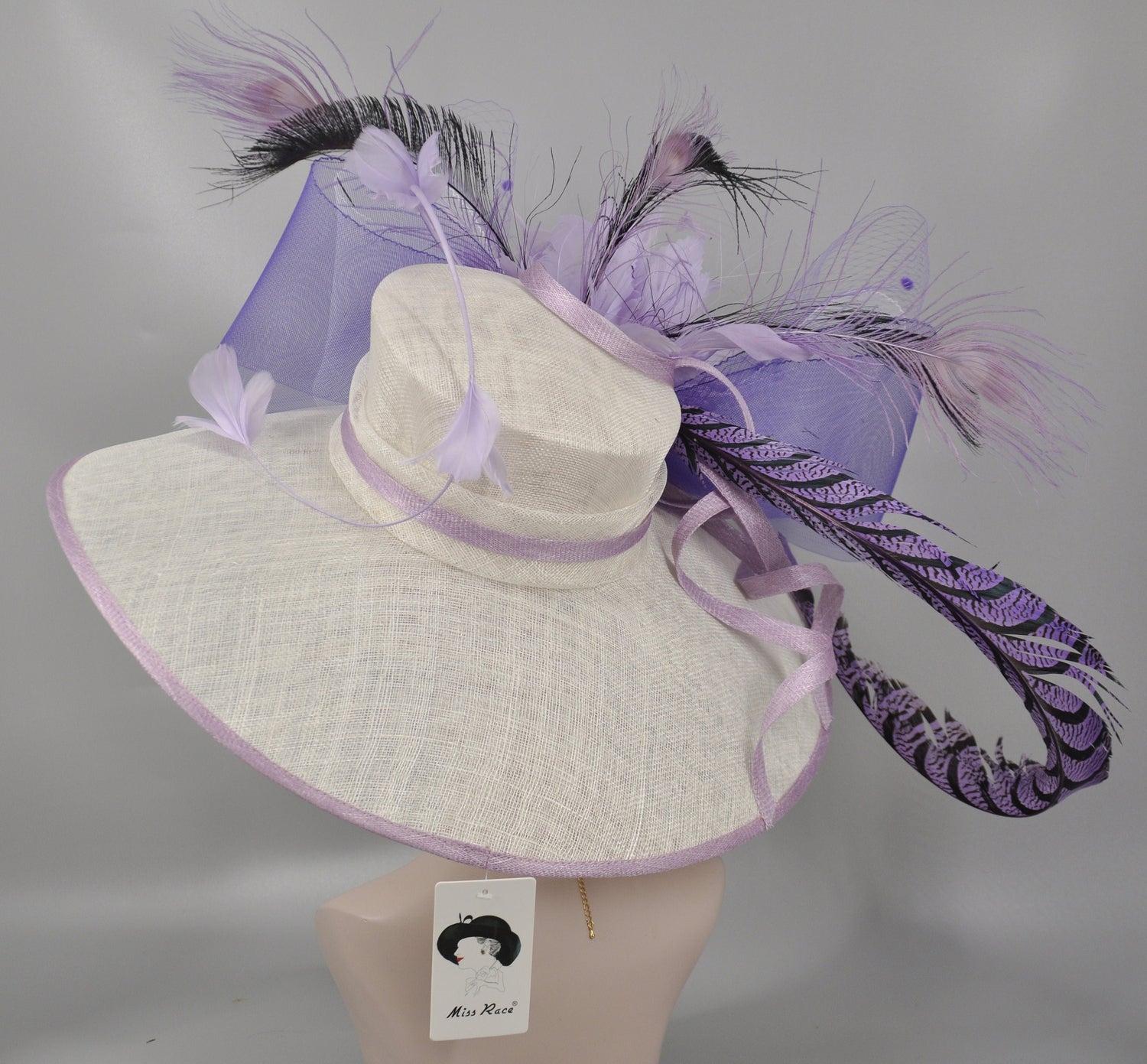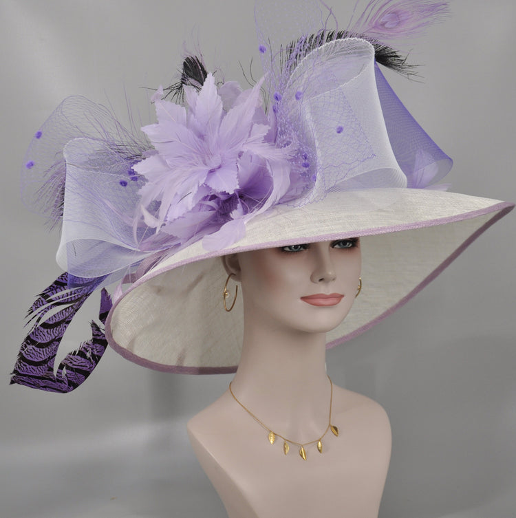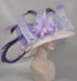 Wide Brim Sinamay Kentucky Derby Hat: Lavender Lilac Feather Flower