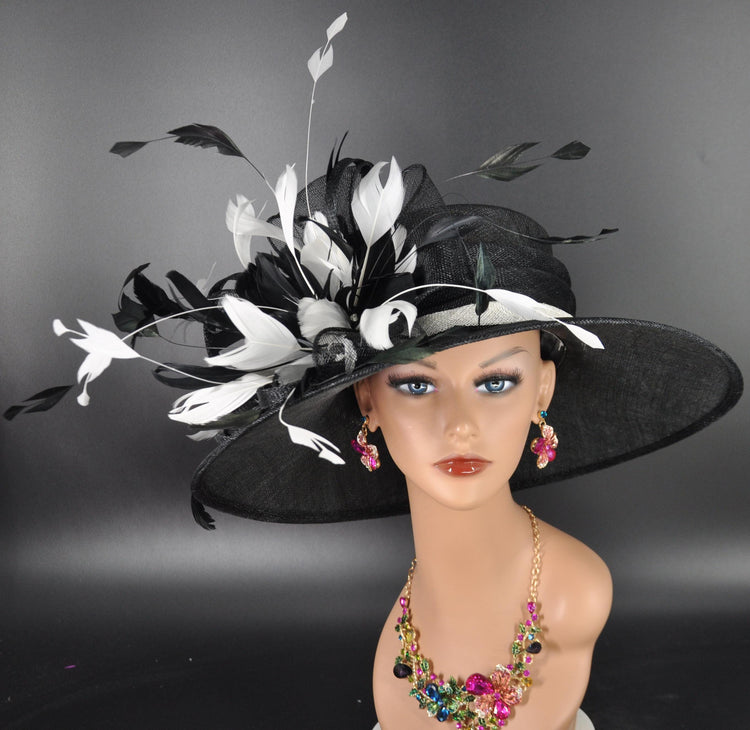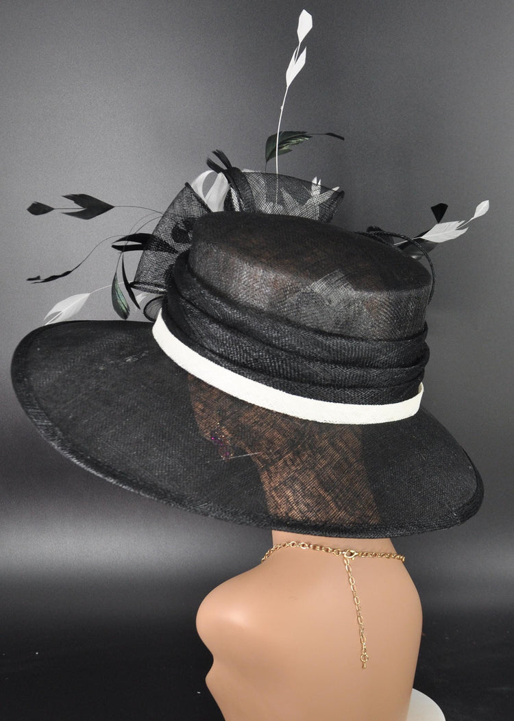 This 3 layers wide brim sinamay hat boasts a captivating ensemble, a few real feathers that add a touch of wild elegance. Accentuating its allure is a generously sized linen sinamay bow, gracefully tying together the essence of sophistication and a hint of untamed charm.