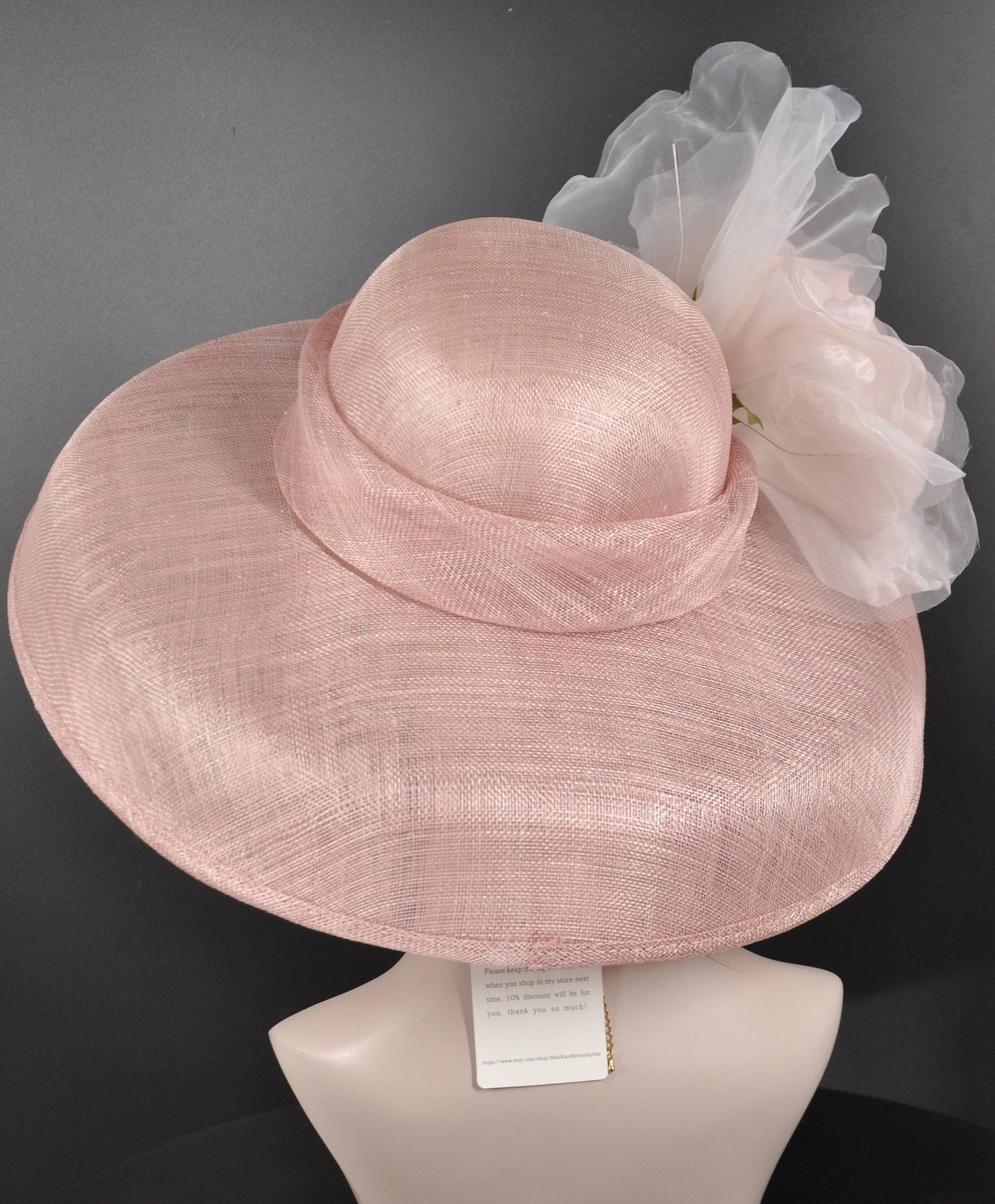 Audrey Hepburn Style Dome Hat Kentucky Derby Hat Tea Party Carriage Wide Brim Sinamay Hat Blush( dusty ) Pink