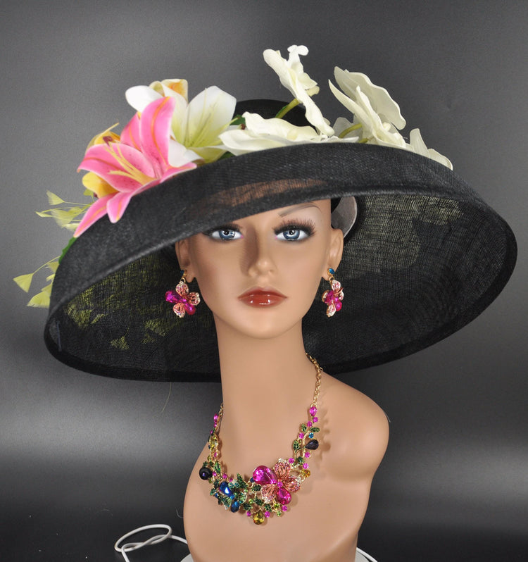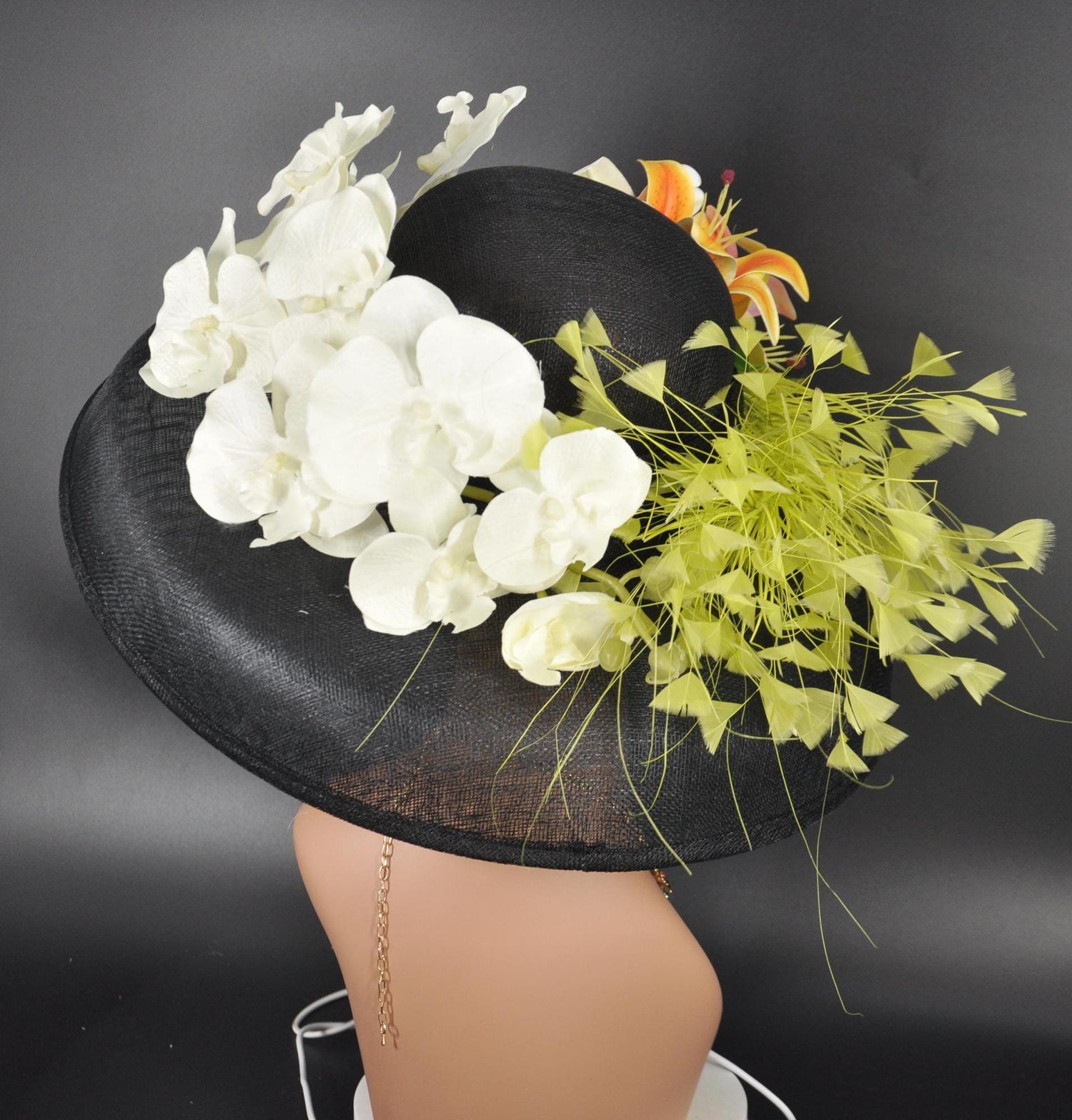 Audrey Hepburn Style Kentucky Derby Hat: Black Sinamay Wide Brim with Orchids