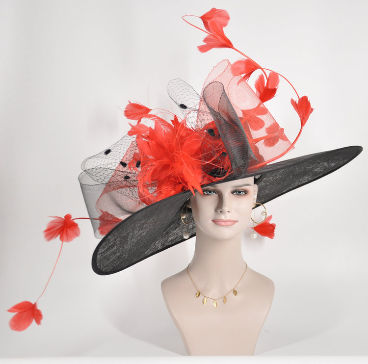 Black Kentucky Derby Hat with Red Feathers: Wide Brim Custom Hat