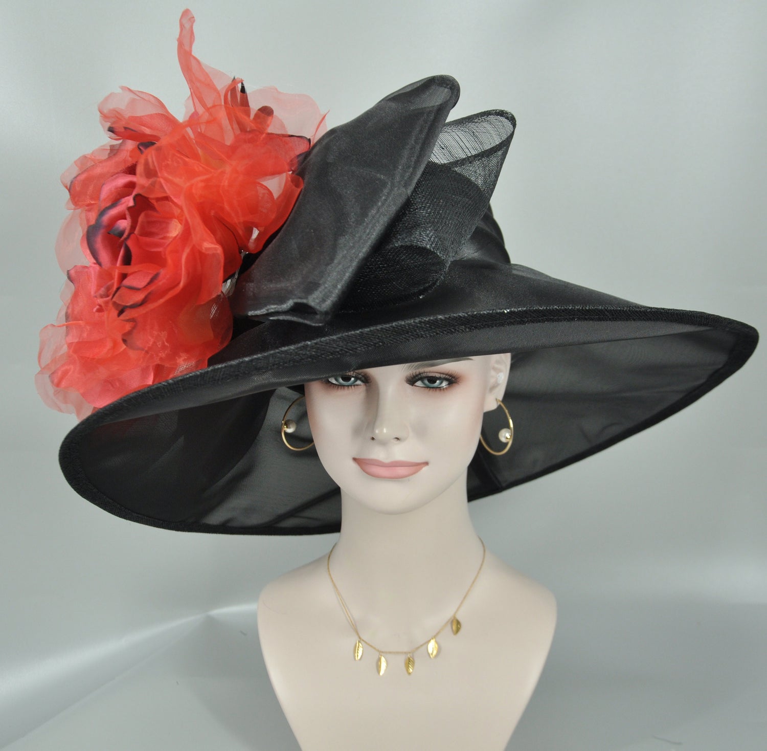 Black + Red Kentucky Derby Hat, Church hat, Tea Party Hat, Custom hat, Formal Hat, Fashion HatWide Brim Sinamay w Organza Hat