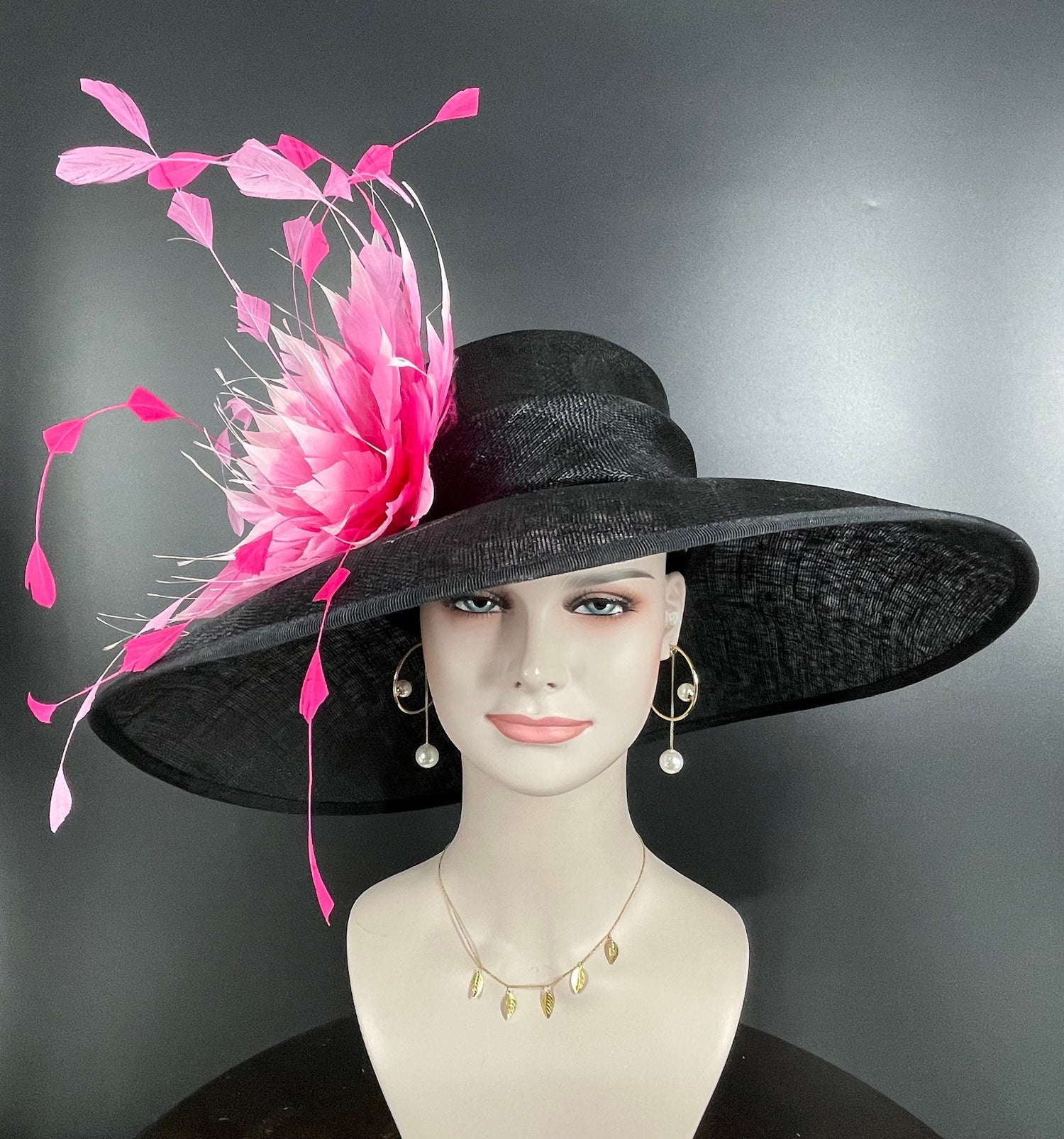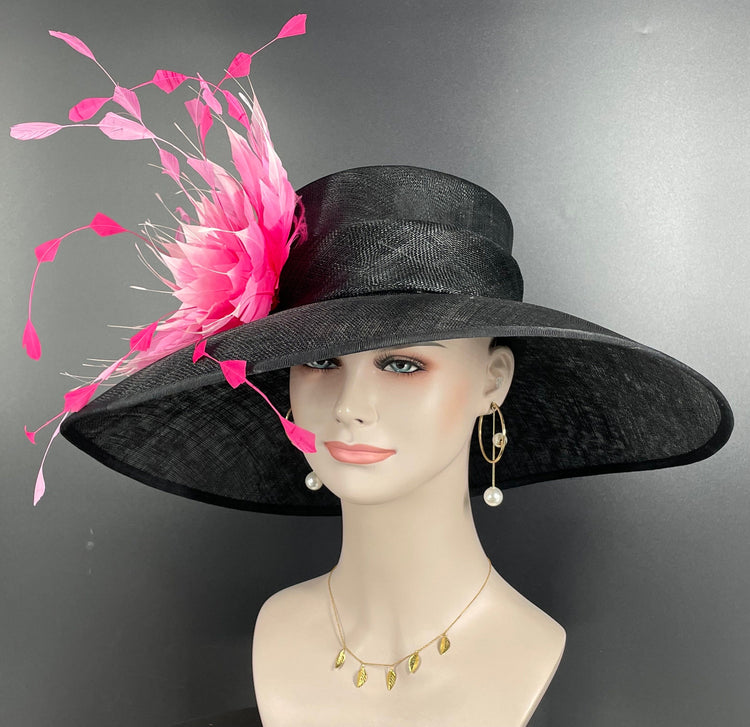 Black Sinamay Derby Hat: Fuchsia Feather Flower Wide Brim