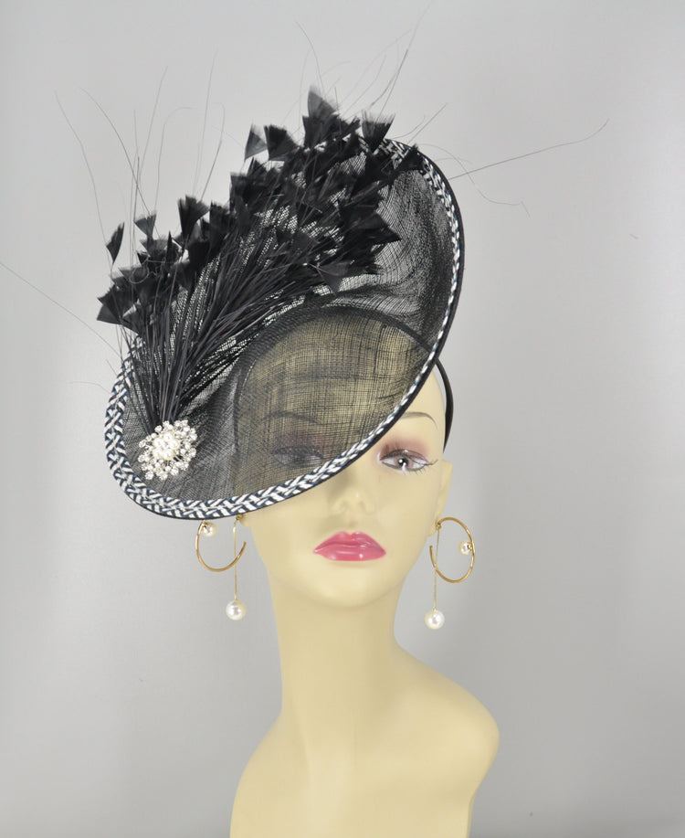 Black Sinamay Fascinator Hat: Feather Flower Kentucky Derby Headband