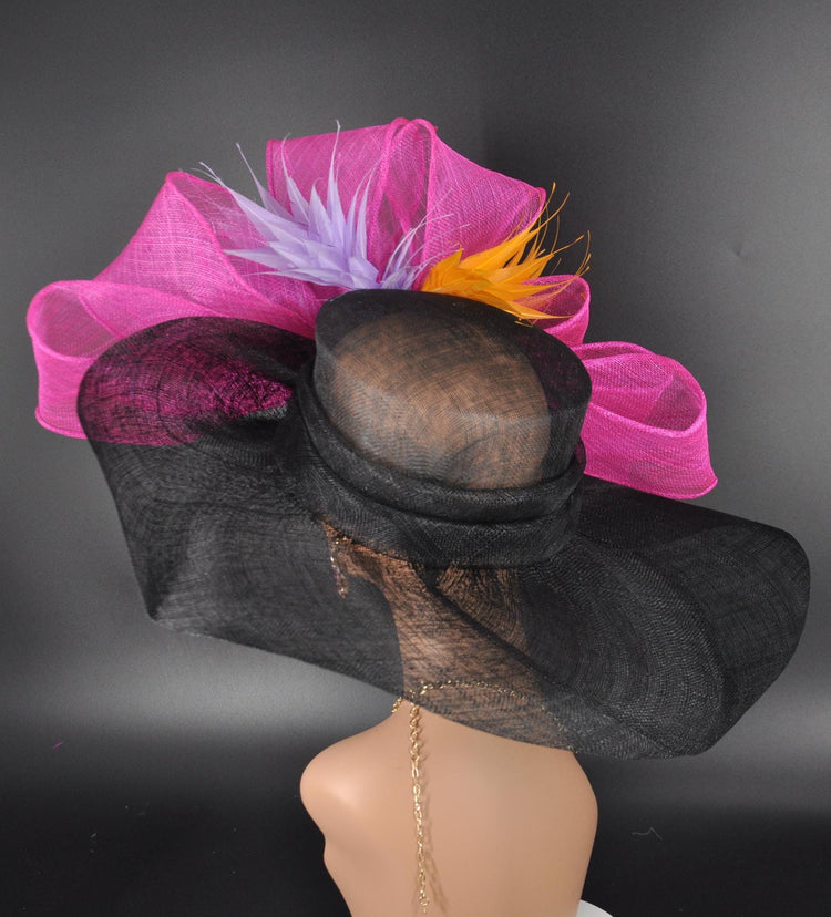 Have questions? Feel free to reach out—we’re happy to help!Make a bold statement at the Kentucky Derby or any elegant event with this breathtaking sinamay hat. Featuring a dramatic fuchsia pink oversized bow, this eye-catching design is perfectly contrasted by a sweeping black brim. The hat is adorned with a striking lavender and white feather floral arrangement, accented with delicate orange wisps for an extra touch of flair. Crafted with expert precision, this one-of-a-kind piece embodies sophistication, confidence, and timeless style. Perfect for race day, weddings, or high-society gatherings, this hat is a true showstopper!