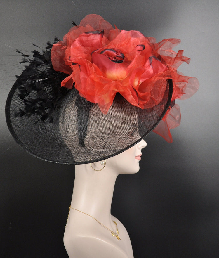 Black Sinamay Kentucky Derby Hat: Red Silk Flower Fascinator