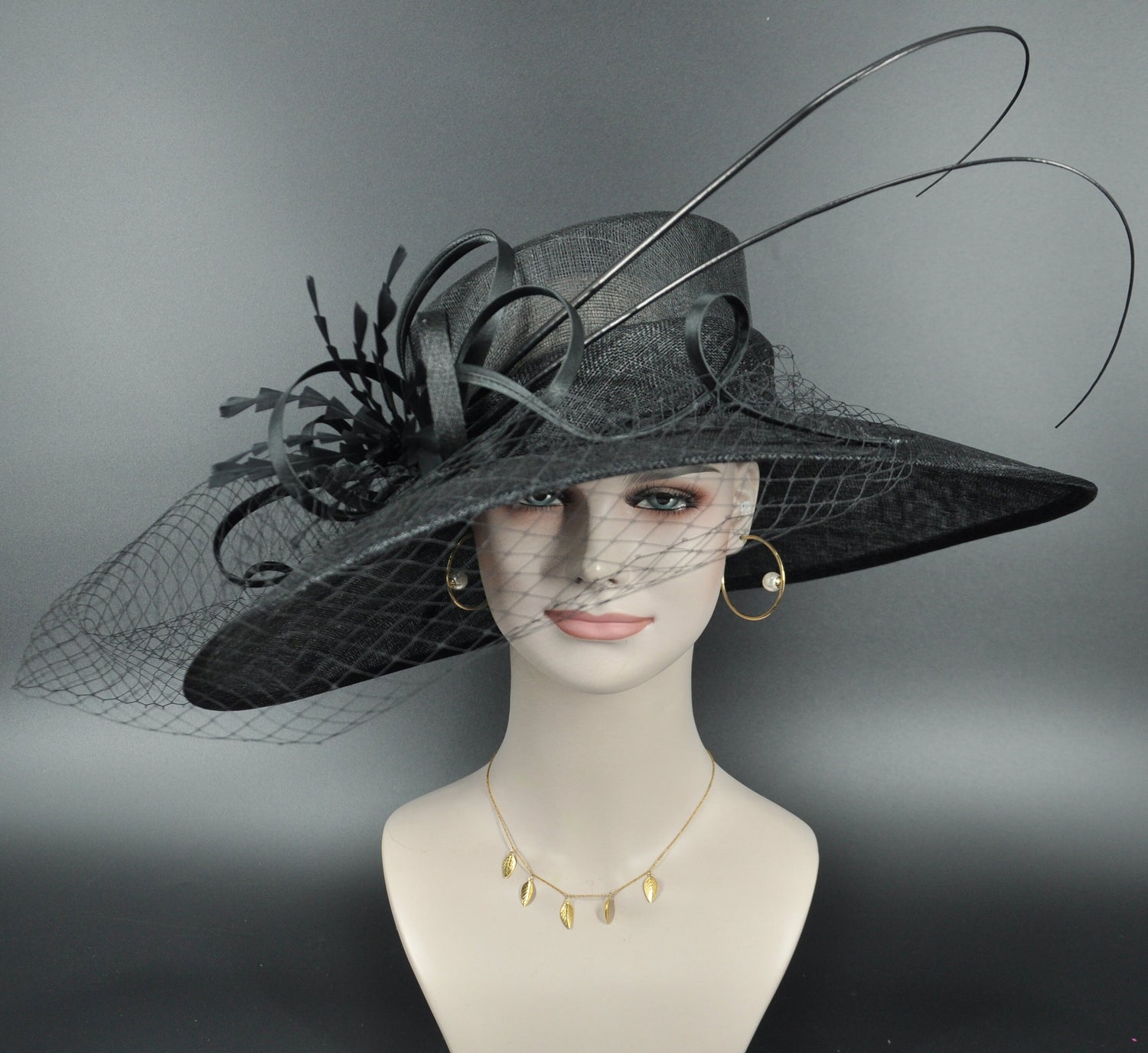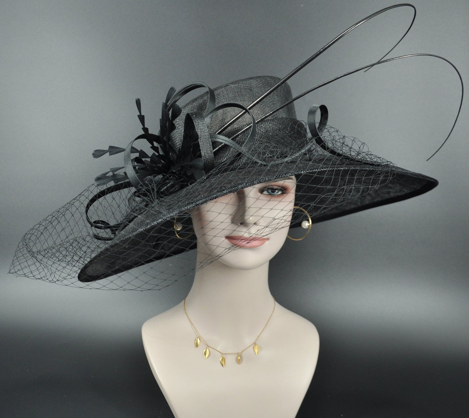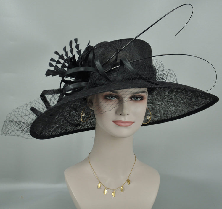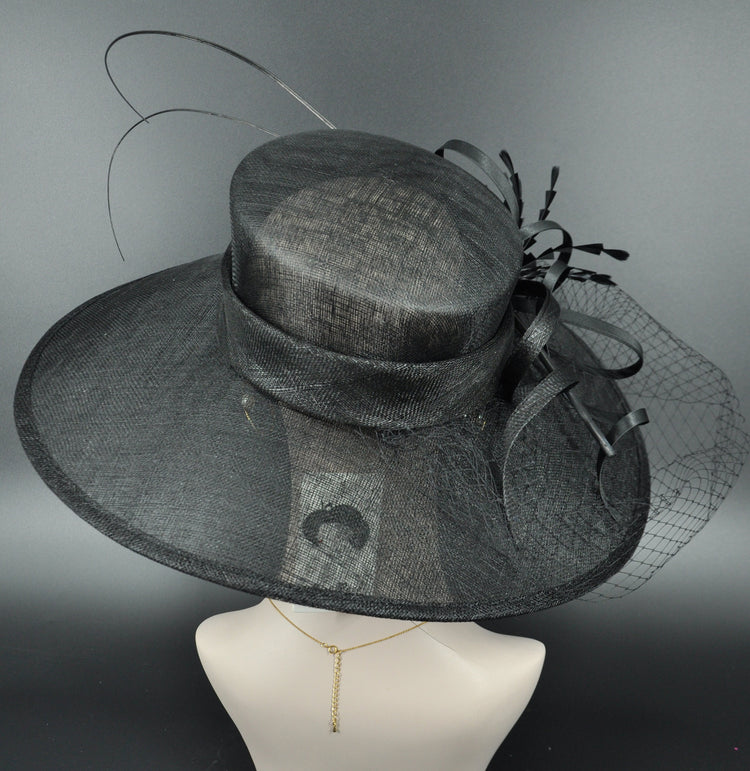 Black Sinamay Wide Brim Derby Hat: Feather Flower Ascot Race Day Hat