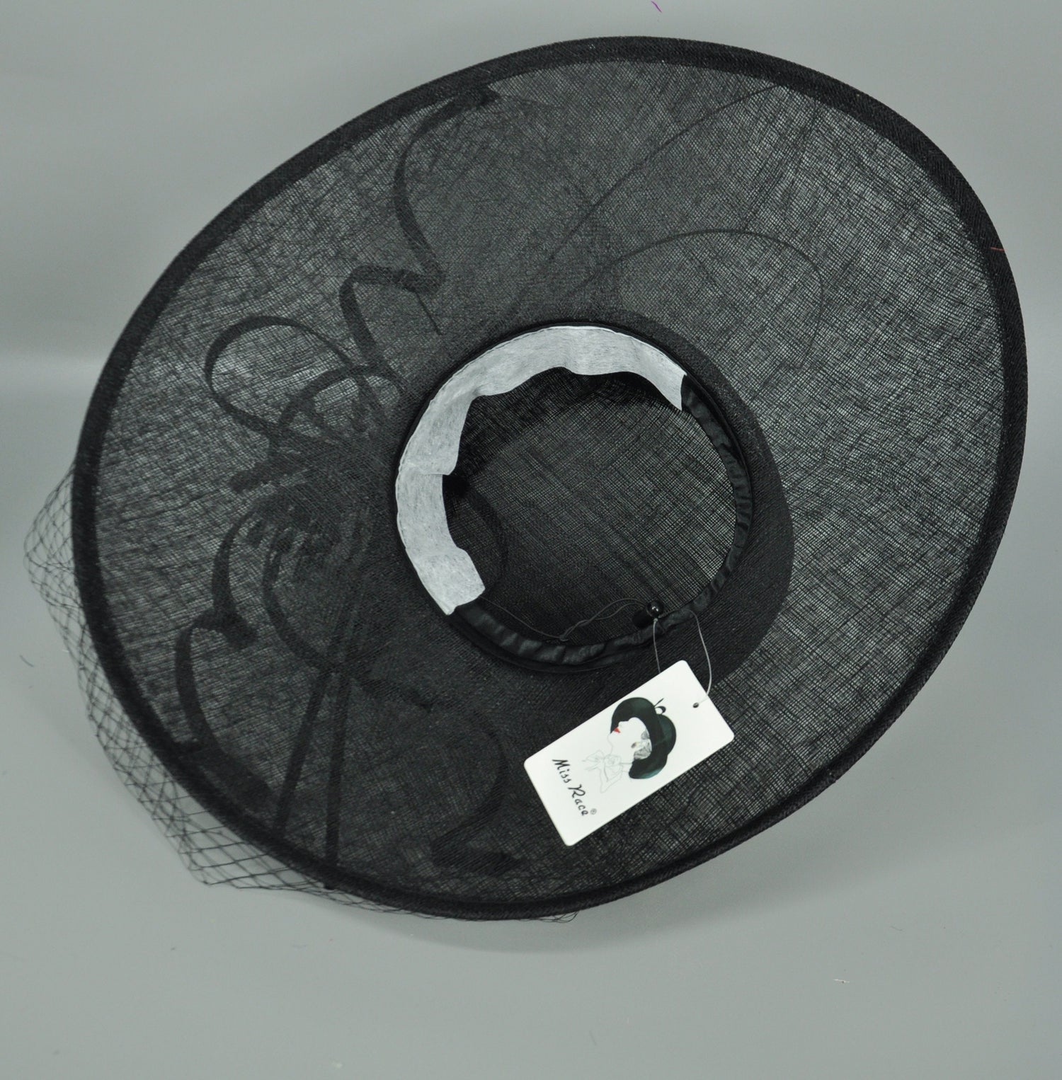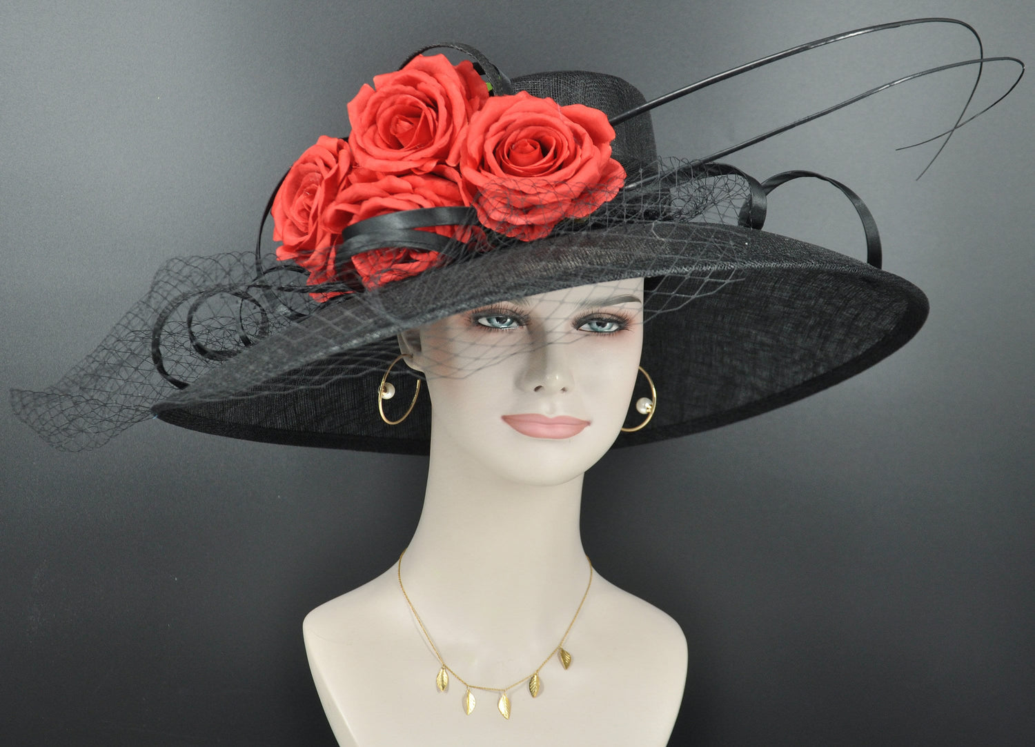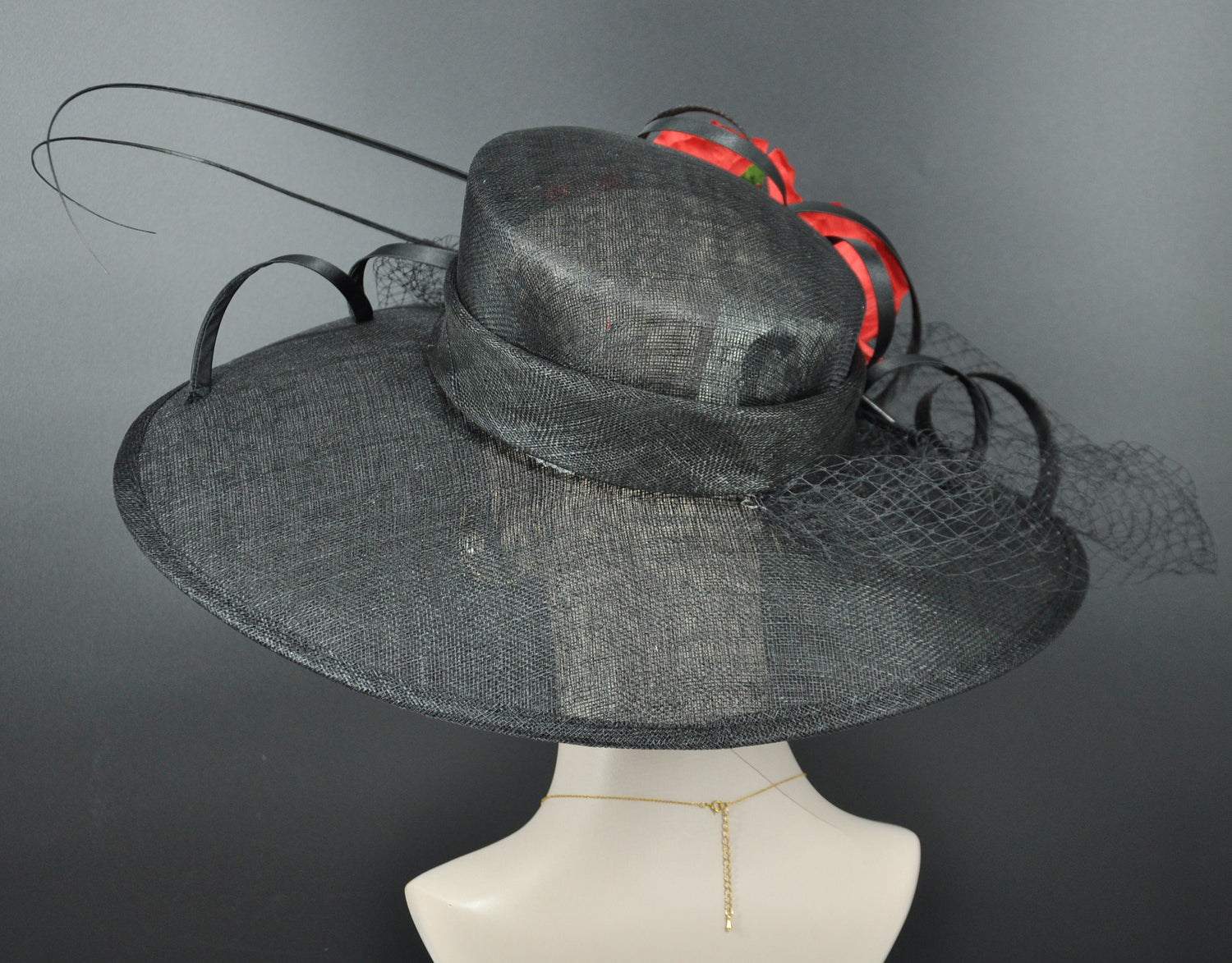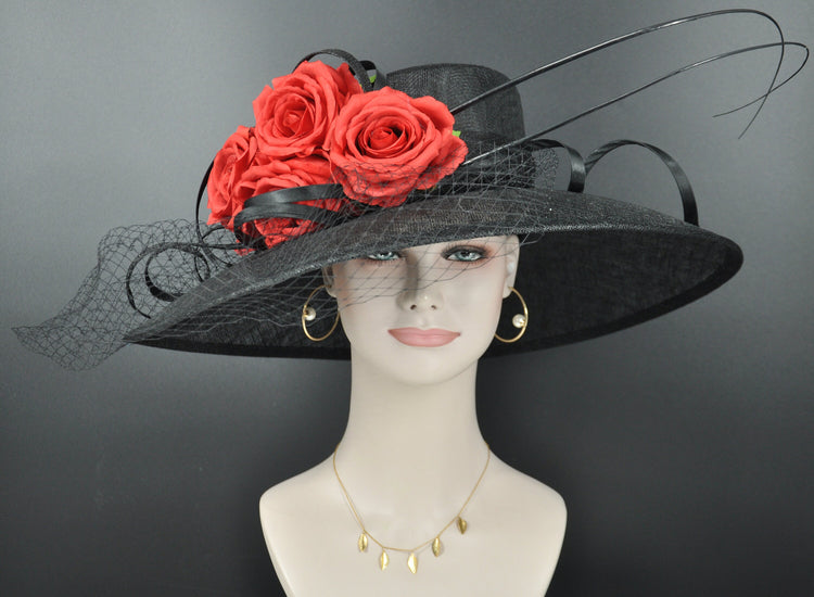 Black Sinamay Wide Brim Hat: Silk Rose Kentucky Derby Church Hat