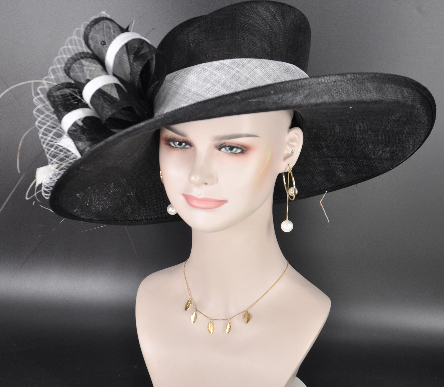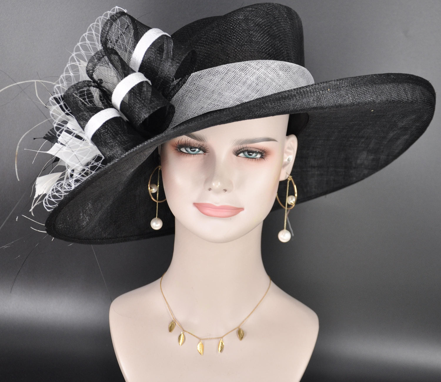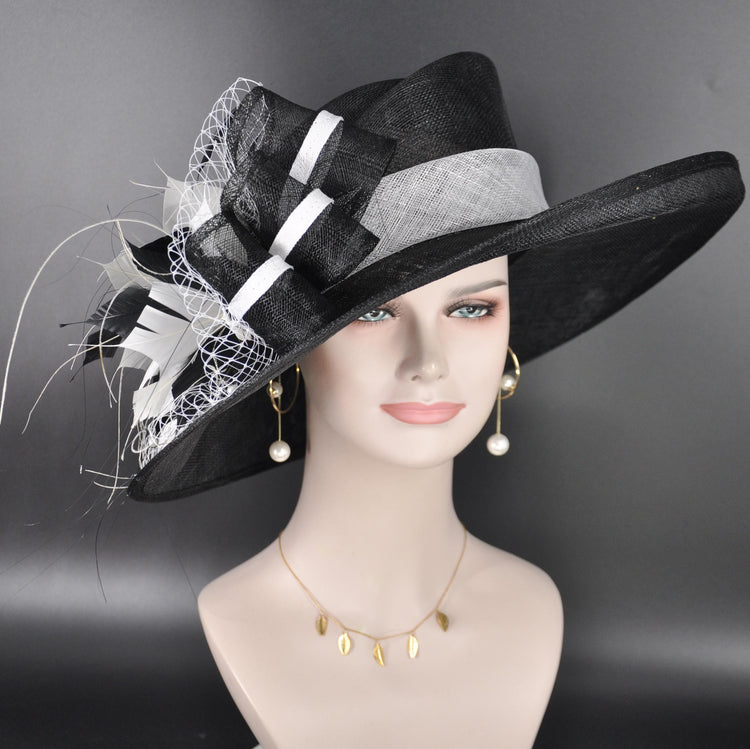 Black w White Kentucky Derby Hat, Wide Brim Sinamay Hat Royal Ascot Hat, Tea Party Hat, Wedding Guest Hat, Spring Racing Hat