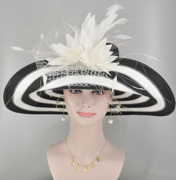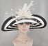 Black & White Feather Flower Derby Hat: Wide Brim Sinamay Straw Tea Party Hat