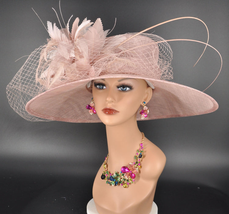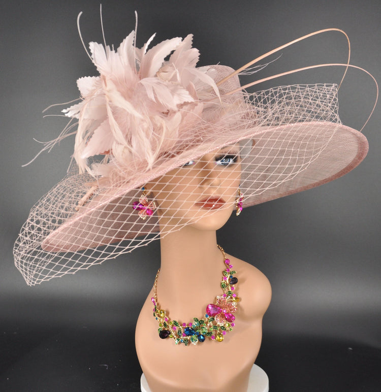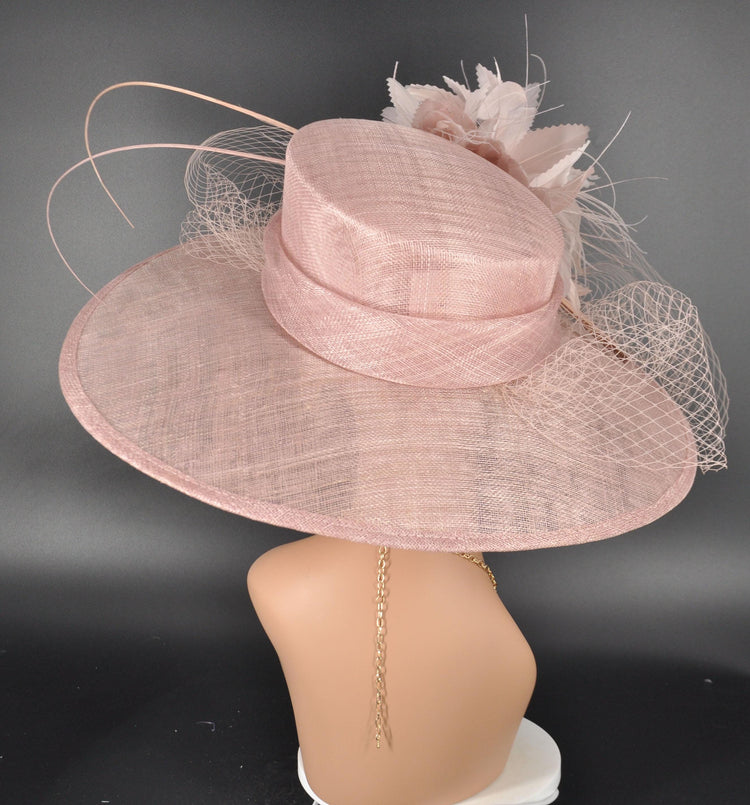 Blush Pink Sinamay Derby Hat: Feather Flower Royal Ascot Hat