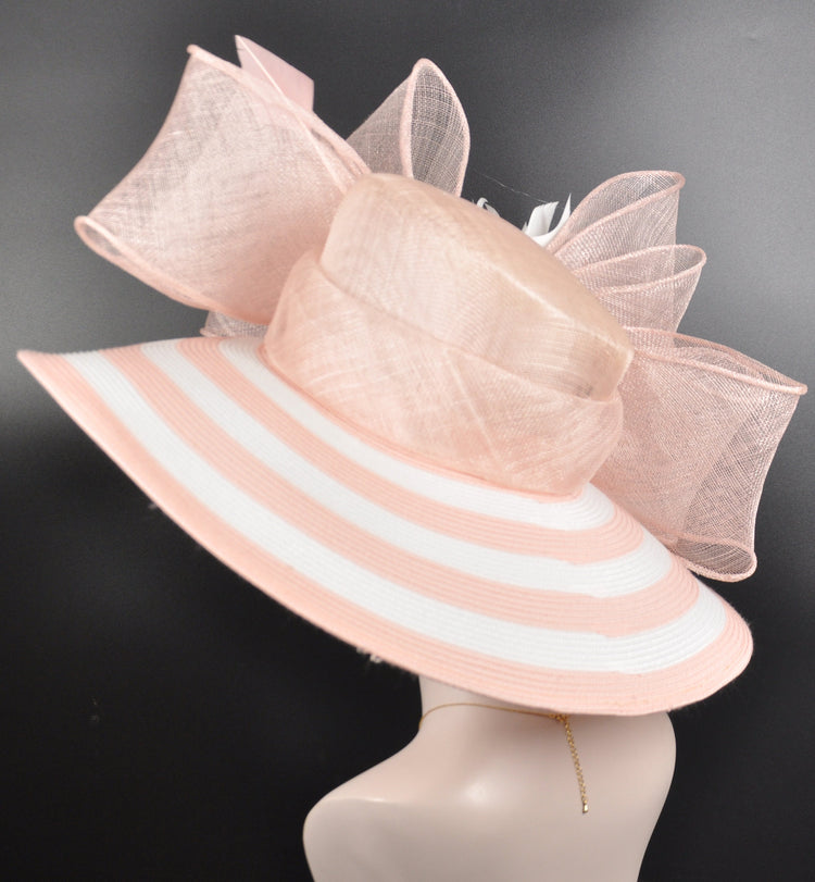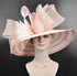 Blush Pink Sinamay Derby Hat: Feather Flowers, Wide Brim Straw