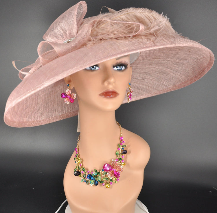 Blush Pink Wide Brim Sinamay Hat Church Kentucky Derby Hat Carriage Tea Party Wedding Rhinstones w Sinamay Bow Ostrich Feather