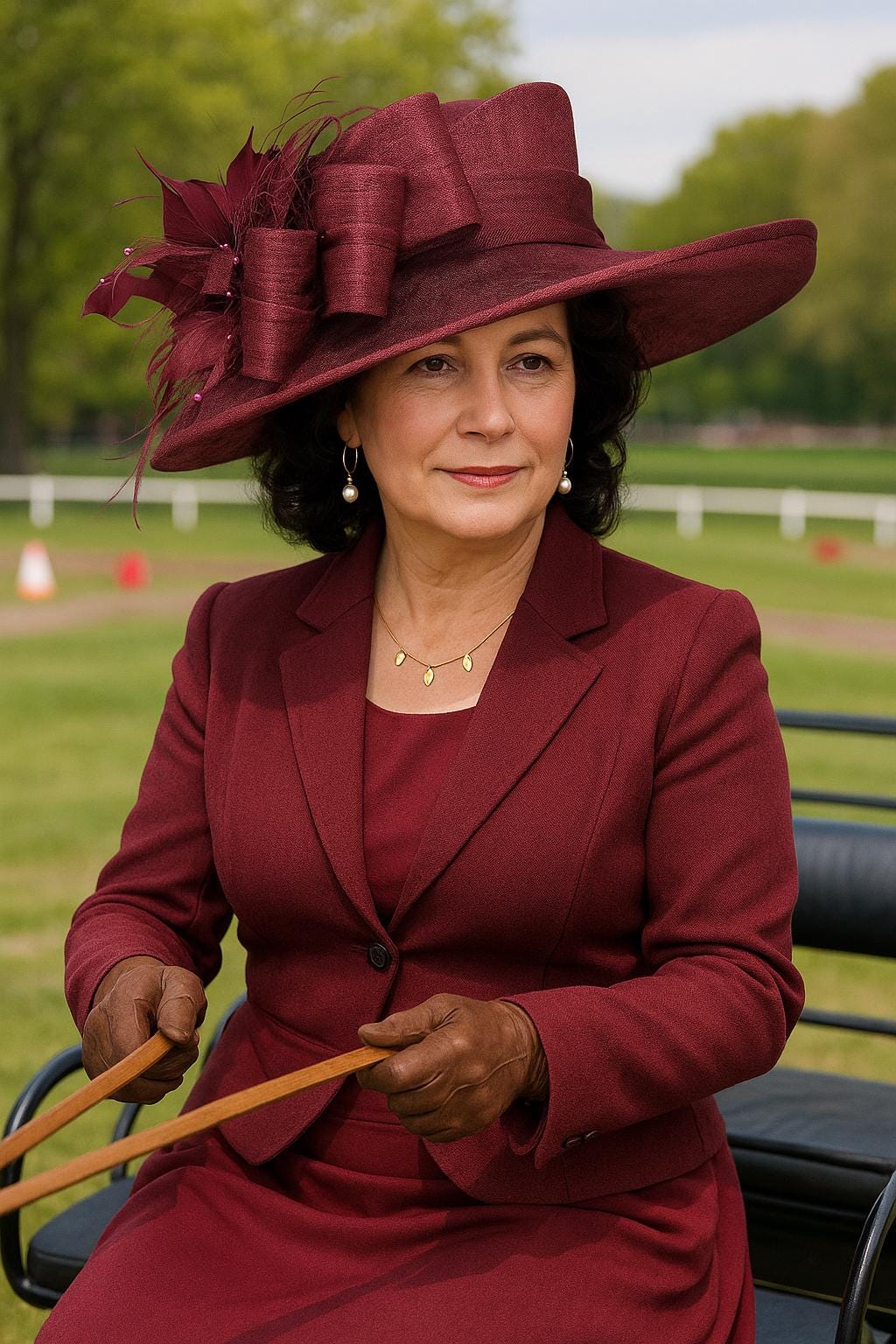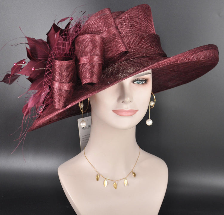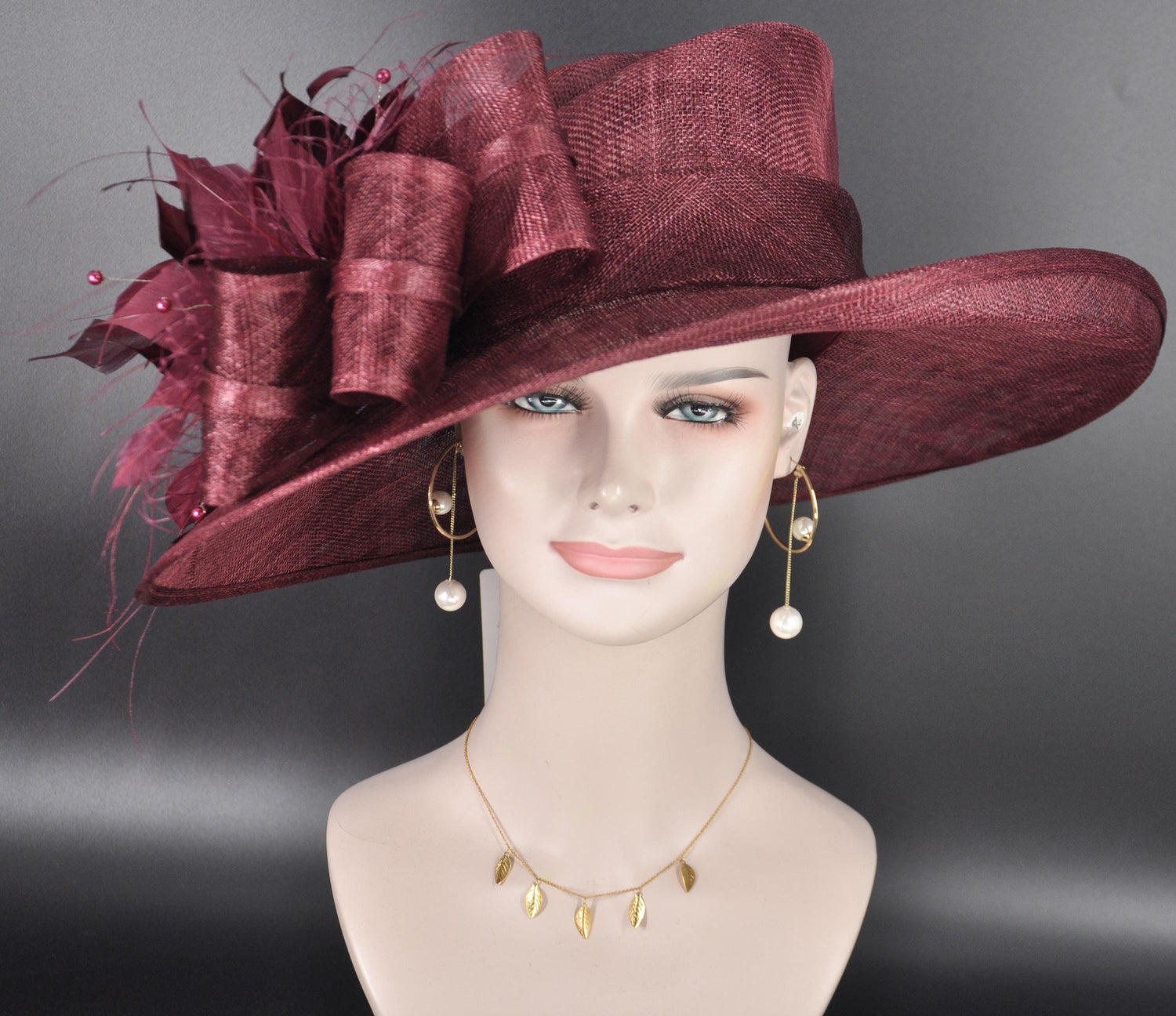 This stunning handcrafted Derby hat is designed to make a statement at any special event. Featuring elegant Burgundy/Maroon/Wine sinamay, vibrant Burgundy/Maroon/Wine accents, decorative bows, and luxurious feathers, this wide-brim hat adds a sophisticated finishing touch to your race-day or formal outfit. Perfect for the Kentucky Derby, Royal Ascot, garden parties, weddings, or any occasion where you want to stand out with timeless elegance.