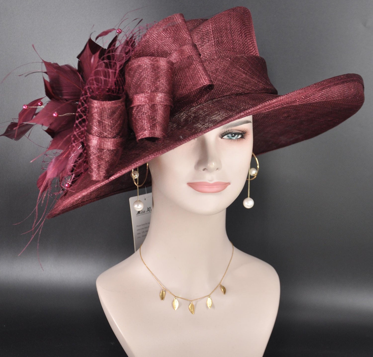Burgundy/Maroon/Wine Kentucky Derby Hat, Wide Brim Sinamay Hat Royal Ascot Hat, Tea Party Hat, Wedding Guest Hat, Carriage Party Hat