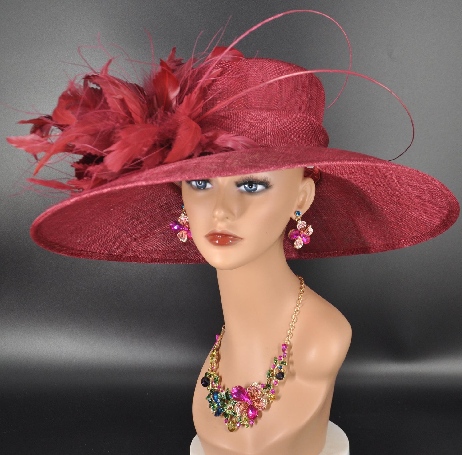 Burgundy Sinamay Derby Hat: Wide Brim Feather Ascot Hat