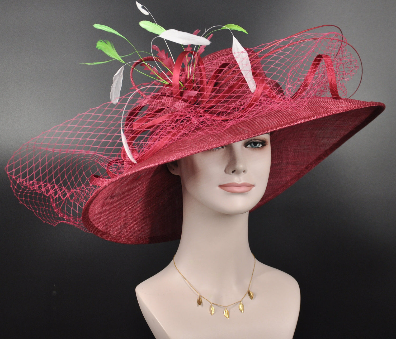 Burgundy Sinamay Wide Brim Hat: Kentucky Derby Feather Flower