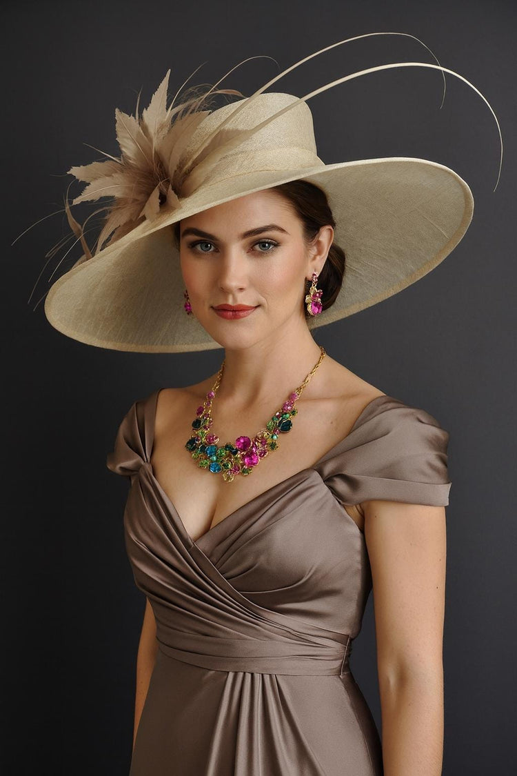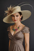 Champagne ( Base Hat) w Taupe (Feather Flower Color) Wide Brim Sinamay Hat: Royal Ascot, Kentucky Derby